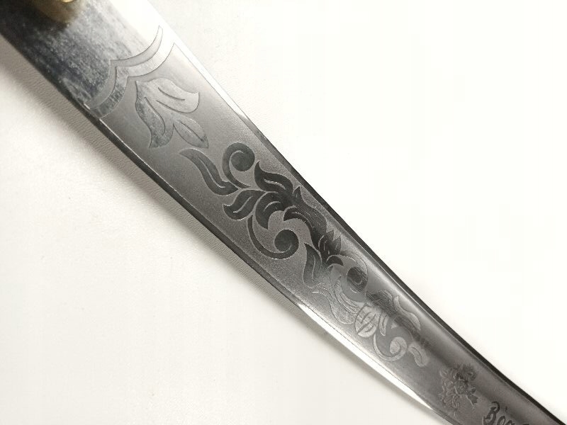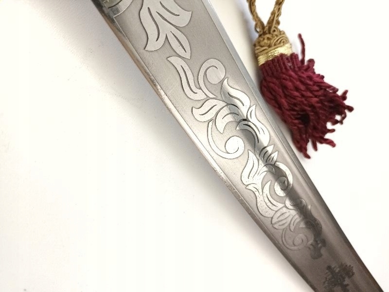 На клинке имеется надпись «Боже, Родину почитай». Ручка полностью закрытая, стилизована под голову орла.