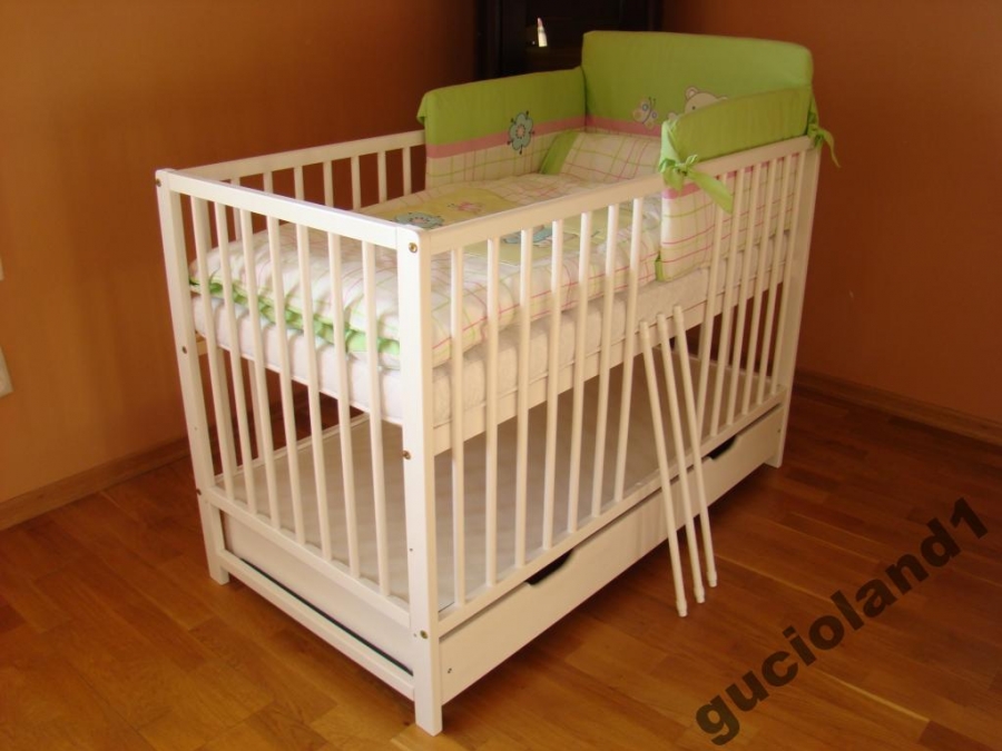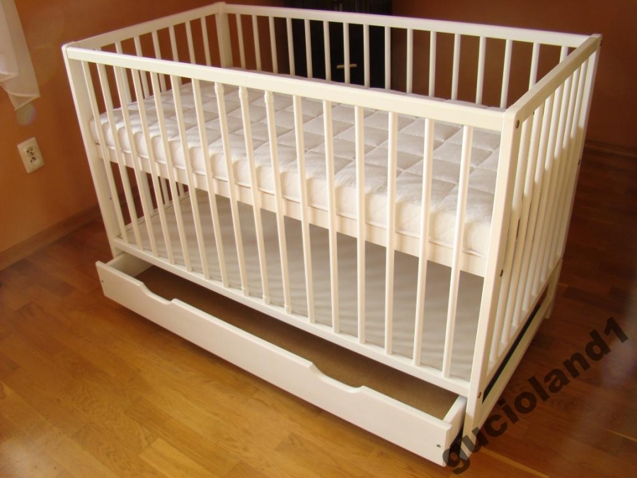 Современные деревянные детские кроватки производства Польши с закрытым выдвижным ящиком, колесиками и направляющими-качалками.