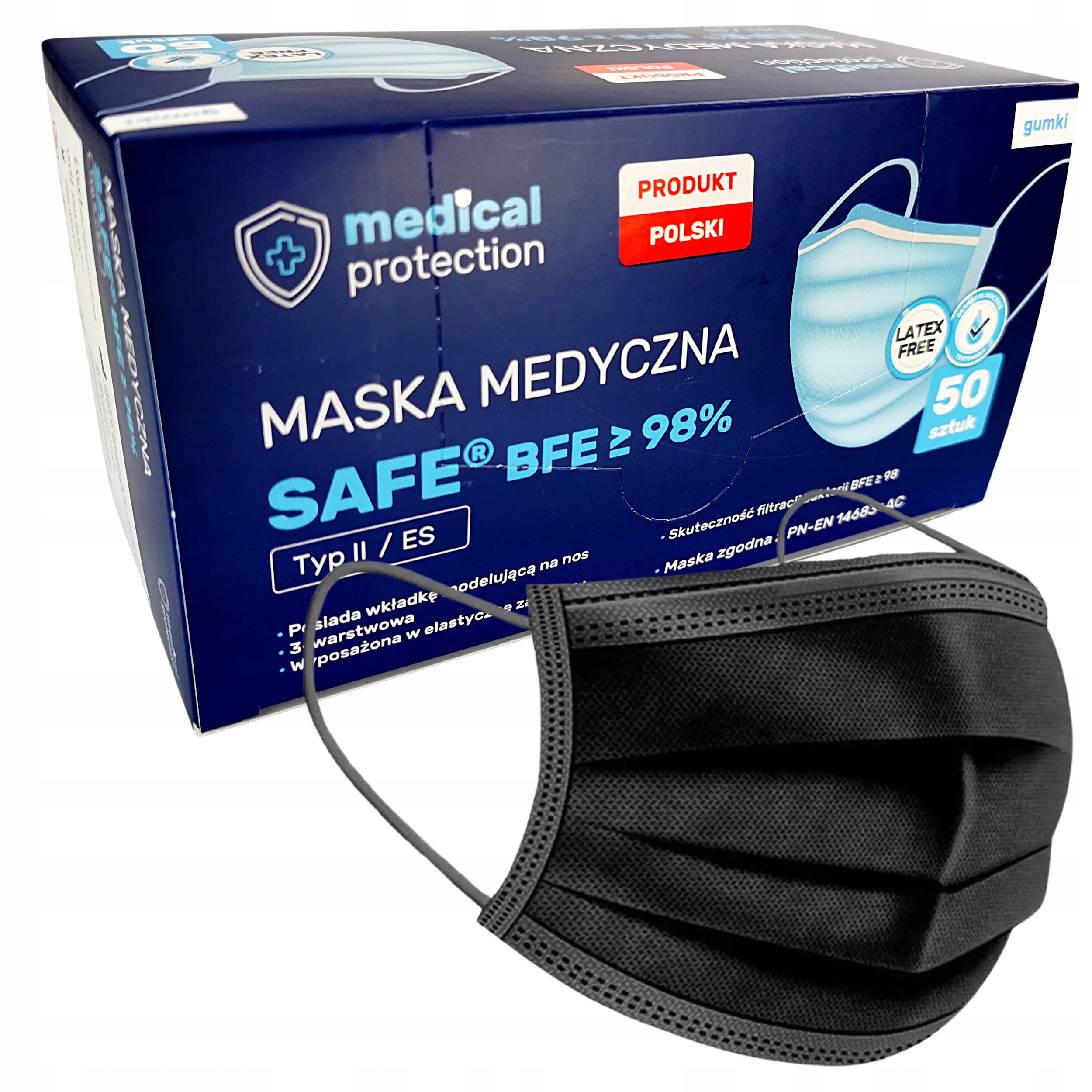 ЧЕРНЫЕ МЕДИЦИНСКИЕ МАСКИ ПРОИЗВОДСТВА ПОЛЬШИ, 3-СЛОЙНЫЕ С ФИЛЬТРОМ, УРОВНЕМ ФИЛЬТРАЦИИ BFE>98%, СЕРТИФИЦИРОВАНЫ С ОДОБРЕНИЕМ ТИПА II/ES, УПАКОВКА ЧЕРНОГО ЦВЕТА