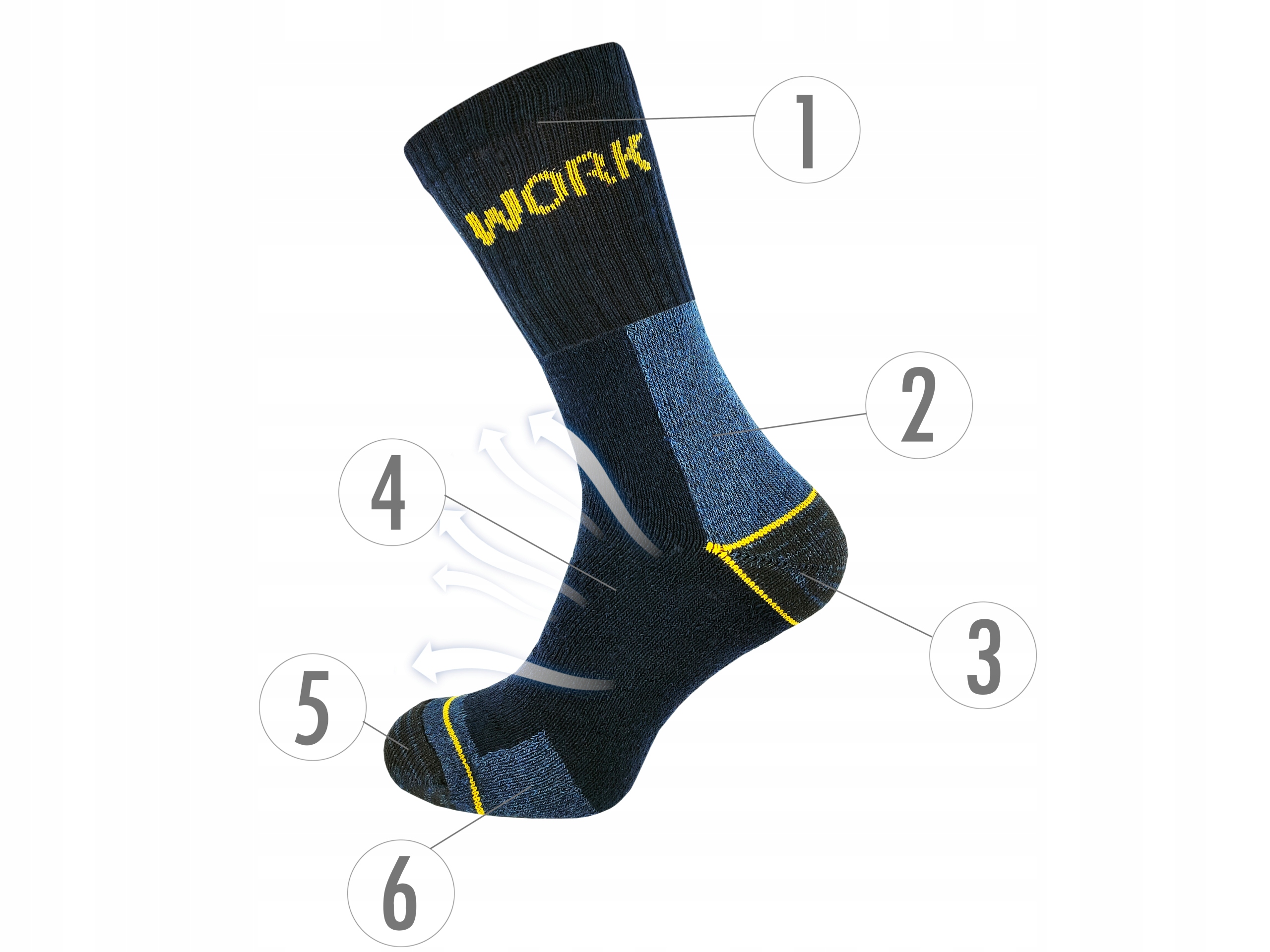 Единственные в Польше рабочие носки по технологии «Взаимно-волоконная пряжа».Носок усилен. с полиамидом снаружи. А изнутри кожа стопы контактирует только с натуральным хлопком. Это обеспечивает исключительную износостойкость, при этом очень комфортно, нежно и дышаще изнутри. На первом этапе использования на носке может оставаться свободный хлопковый ворс, эффект исчезает после нескольких стирок в перевернутом виде носков и на долговечность изделия это не влияет.