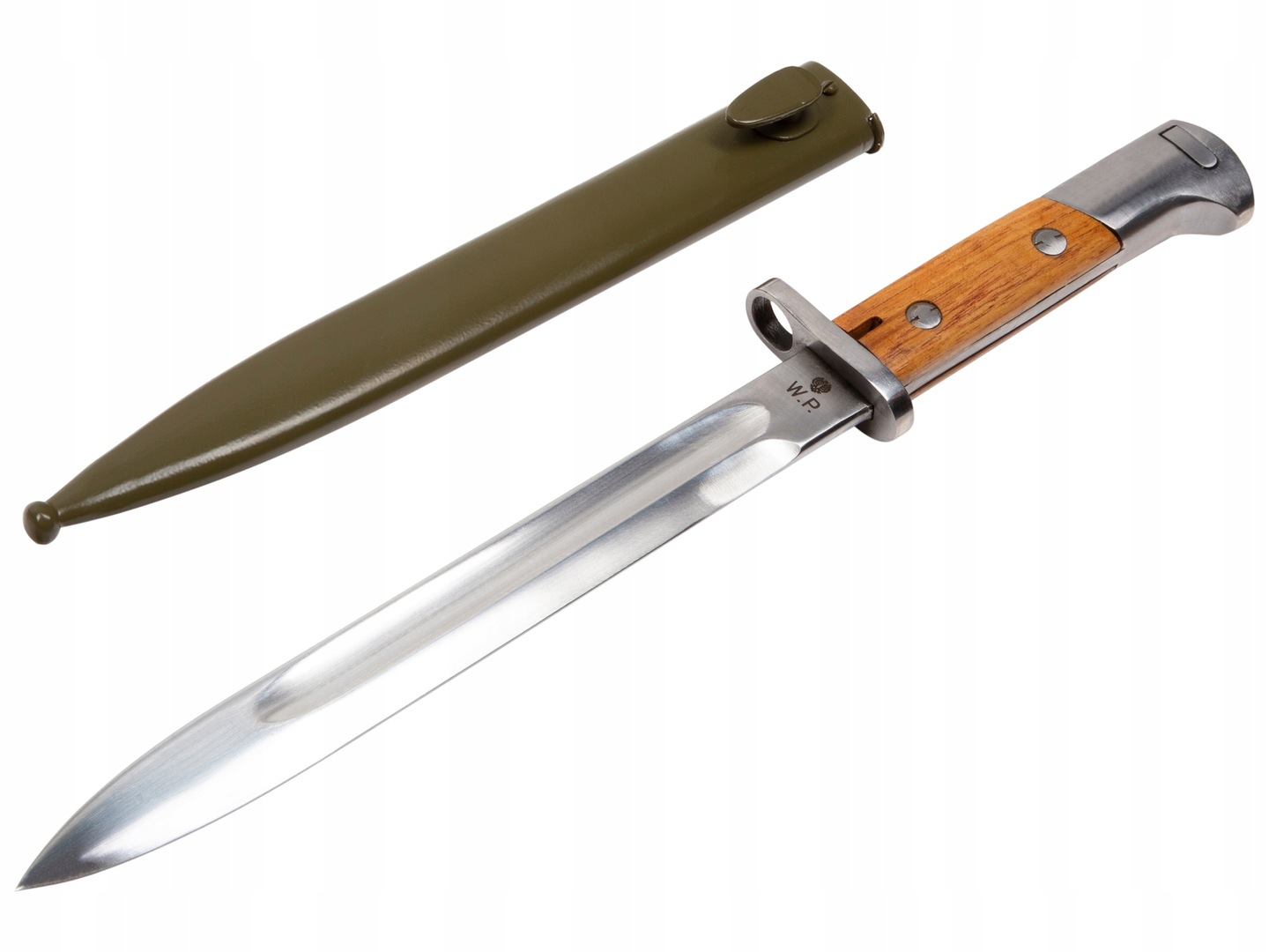Штык изготовлен из стали, имеет деревянные накладки.