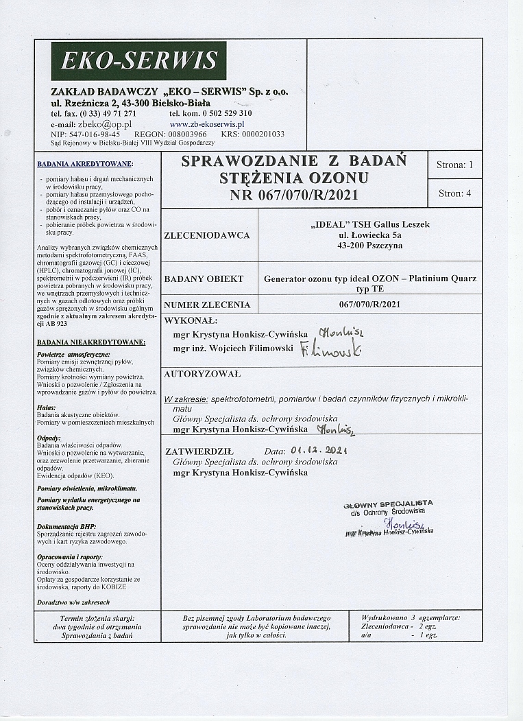 - ОТЧЕТ О ИСПЫТАНИЯ НА КОНЦЕНТРАЦИЯ ОЗОНА - проведены