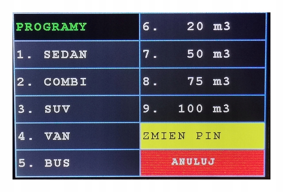 - автоматические программы озонирования автомобилей: СЕДАН, КОМБИ, Внедорожник, ФУРГОН, АВТОБУС