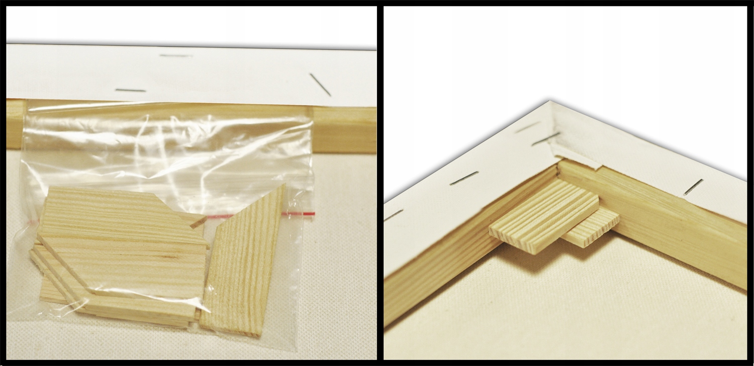 Наши полотна имеют полосовой профиль из высушенной древесины сосны, устойчивой к деформации. Каждое полотно полотна оснащено 8 клиньями и вешалкой с гвоздями для самостоятельной сборки.