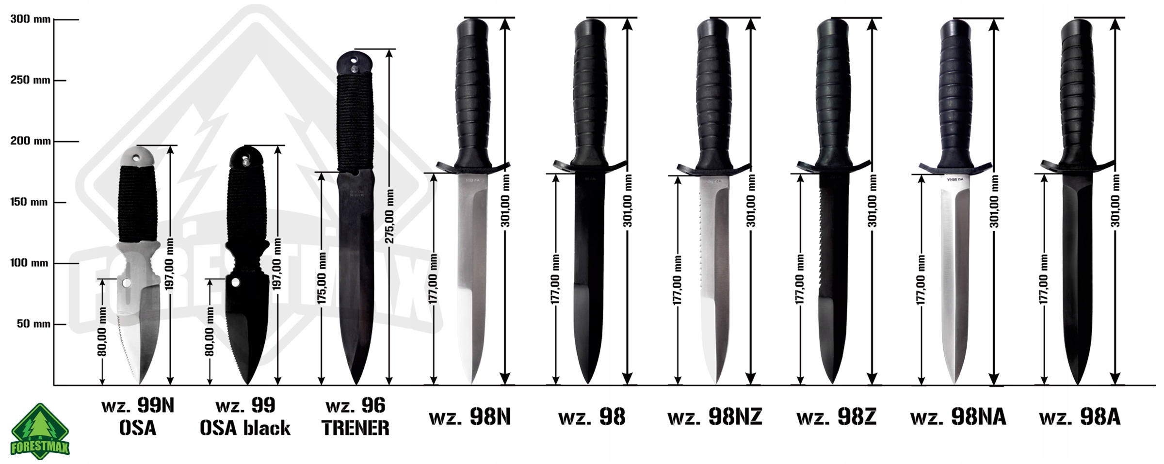 В модели WZ. 98 и WZ. 98N использовали одностороннее лезвие с гладкой задней частью лезвия и небольшим тупого порога, который защищает стальной Jelec, с отверстием, закрепляющим нож из влагалища.