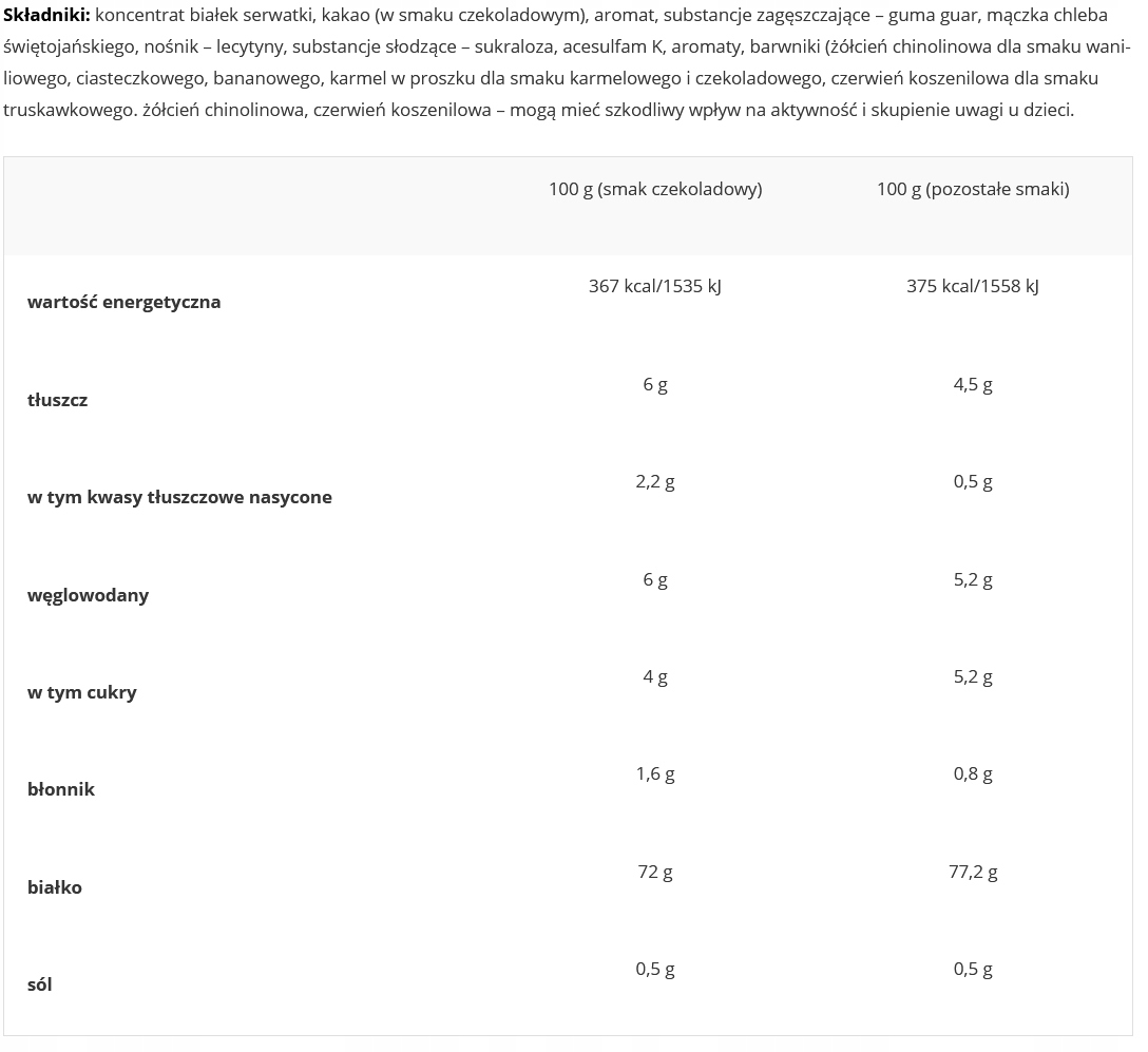 концентрат сывороточного белка (из молока), какао (в шоколадном вкусе), аромат, лимонная кислота (на клубничном вкусе), загустительное вещество (карбоксиметилцеллюлоза натрия), подсластитель (сукралоза, ацесульфам К), черный морков Торт с малиной, клубничный мороженое, белый шоколад-марш, вишневый йогурт), красители (Carotens for Alvors: ваниль, ванильный миндаль, банан, манго-банана, пирог, ананас из белого шоколада, коричневая, яблочная коричница, клубника, ванильный чезой, маскарпоновый лимонный пирог, ванильный ймой, печчик;