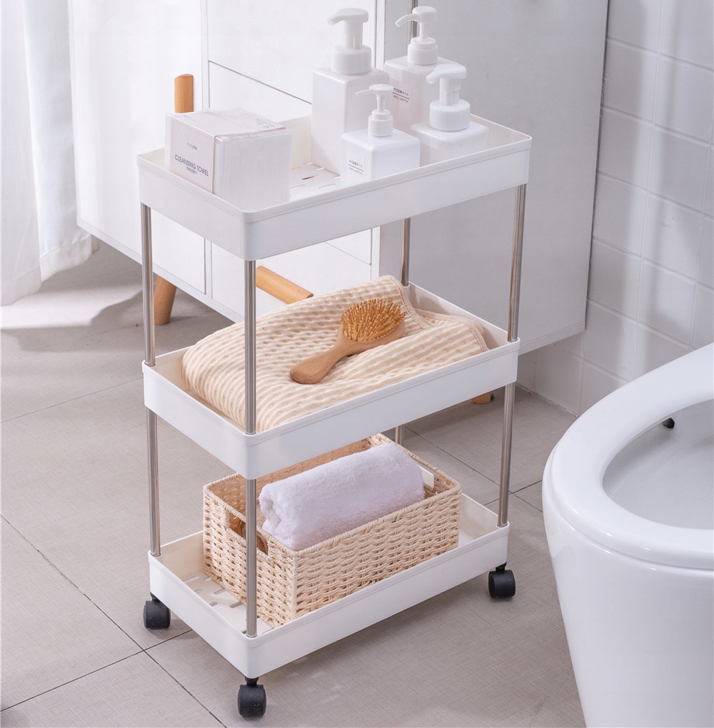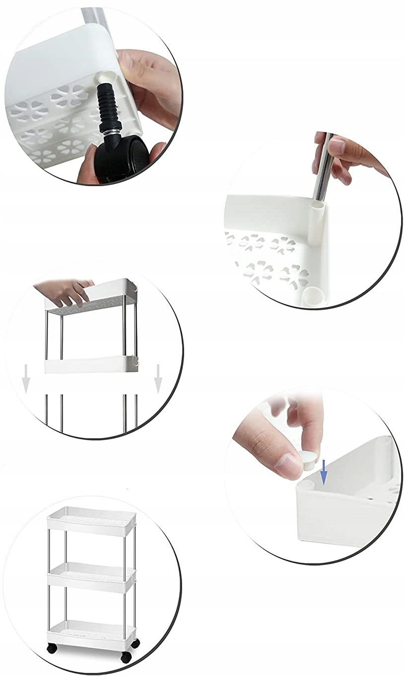 <р>1. цвет белый <р>2. колеса для легкого перемещения, вращающиеся на 360 градусов <р>3. Широкие полки <р>4. Материал: пластик/нержавеющая сталь <р>5. 6 крючков для подвешивания различных предметов <р>6. Стальные вертикальные опоры