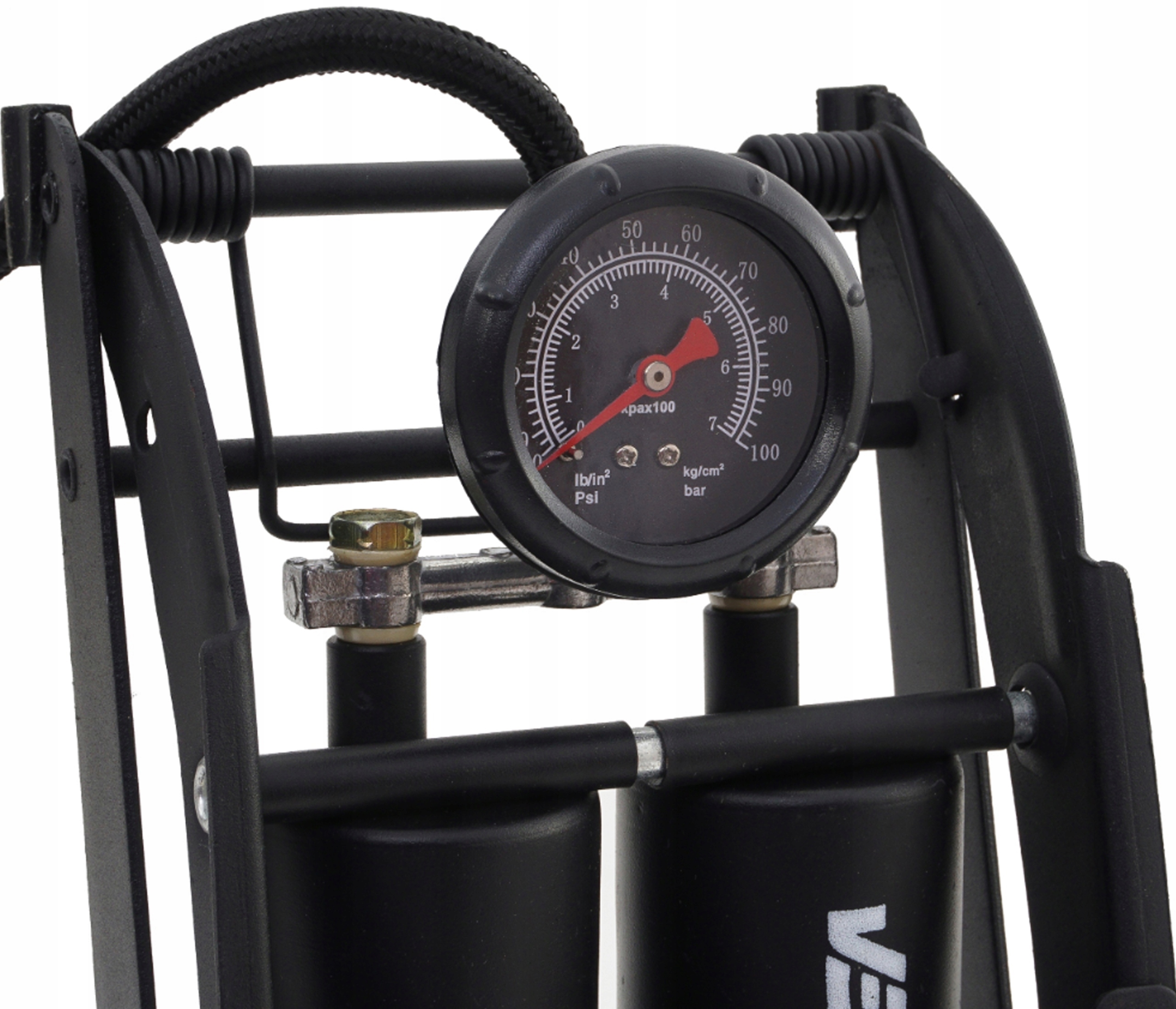 Двухпоршневой ножной насос VERKE. Насос прочной конструкции, изготовлен из рельефного лакированного стального листа толщиной 3 мм. Ножки насосапокрыты резиной для лучшей стабилизации. Удобный манометр показывает значения в барах (0–7) и фунтах на квадратный дюйм (0–100). Прочный и гибкий шланг длиной 550 мм. В комплект входят три адаптера. Идеально подходит для профессиональных услуг и домашнего использования.