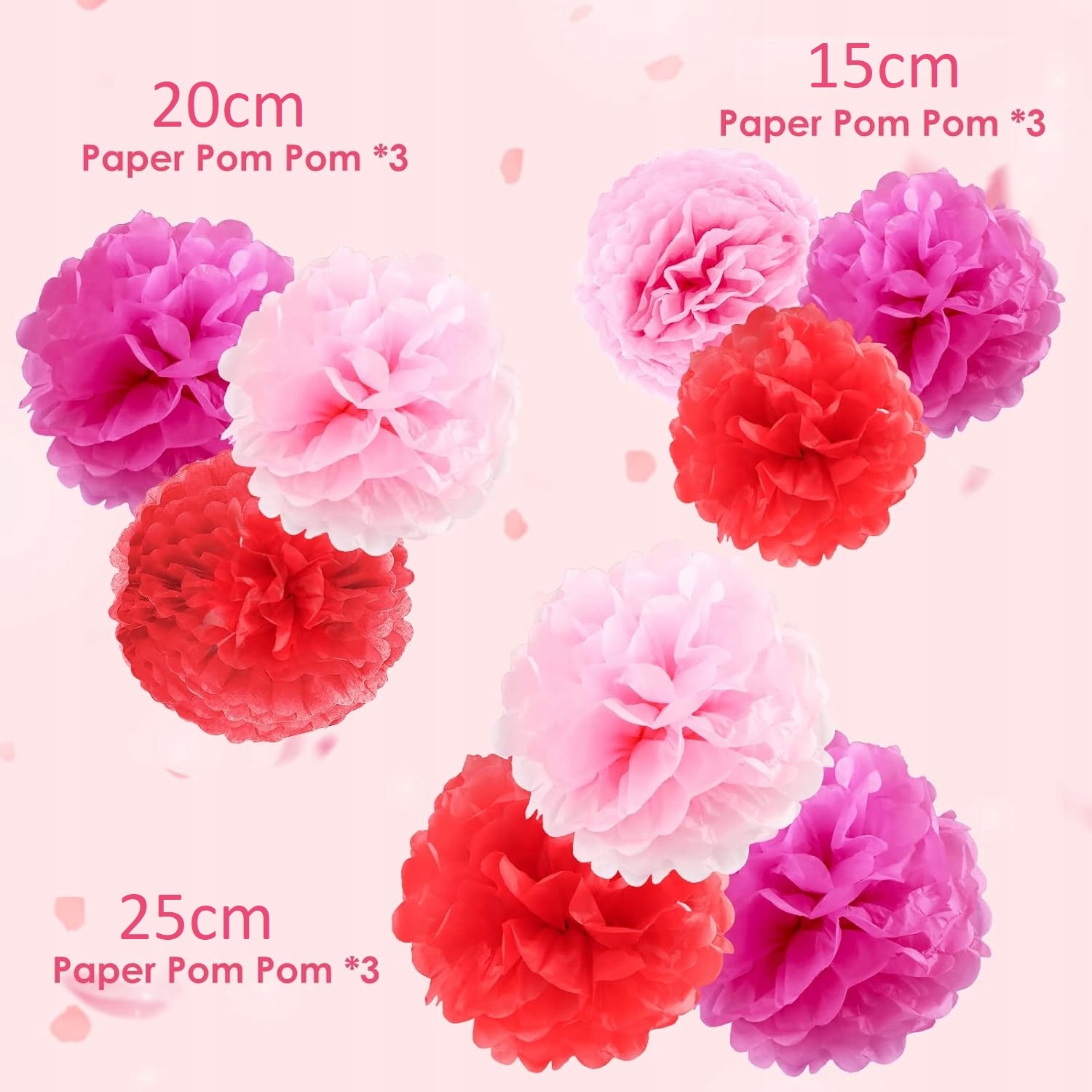 - Содержимое коробки: декоративный набор с помпонами включает 3 розовых помпона размером 10 см, 3 светло-розовых помпона размером 20 см, 3 красных помпона размером 25 см.< /li>