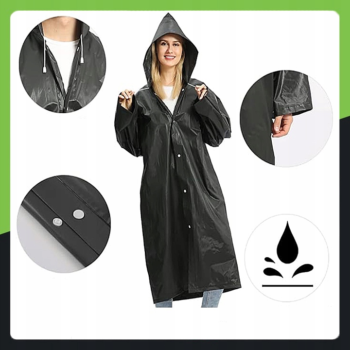 Практичный и легкий дождевик-пончо — незаменимая защита от внезапного дождя. Изготовленный из водонепроницаемого материала EVA, он эффективно защищает от намокания, закрывая большую часть тела и одежды. Идеально подходит для женщин и мужчин — идеально подходит для прогулок, поездок, фестивалей, езды на велосипеде или ежедневных поездок на работу.