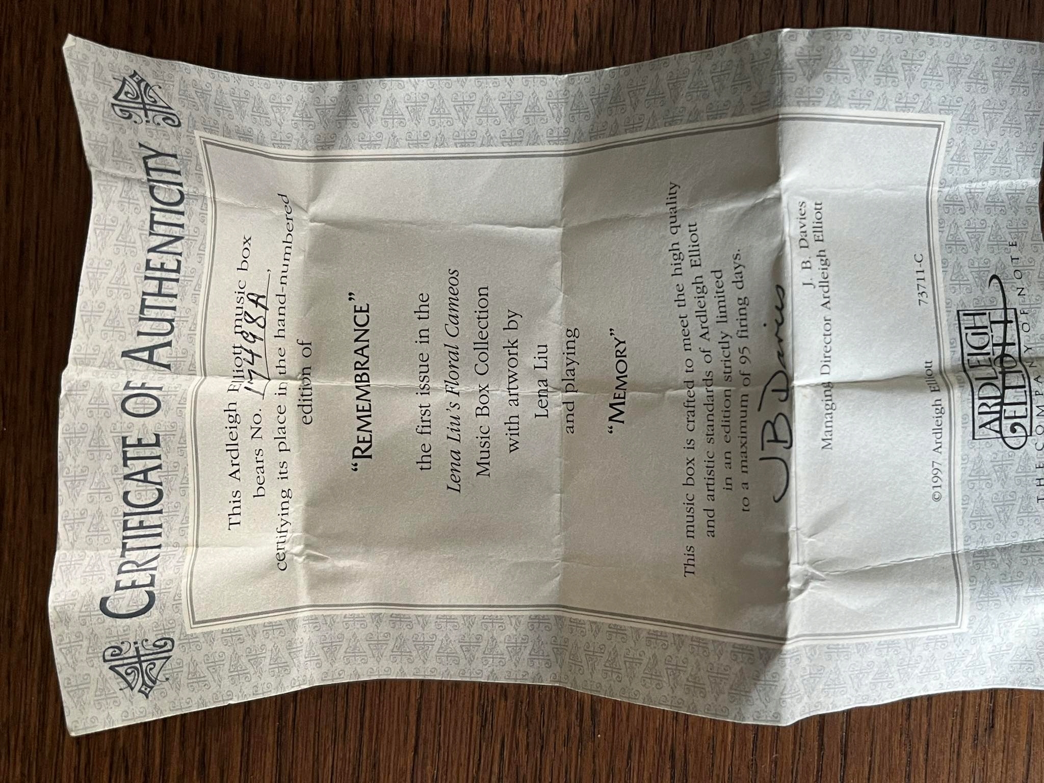 Porcelanowa pozytywka Remembrance Floral Cameos z certyfikatem