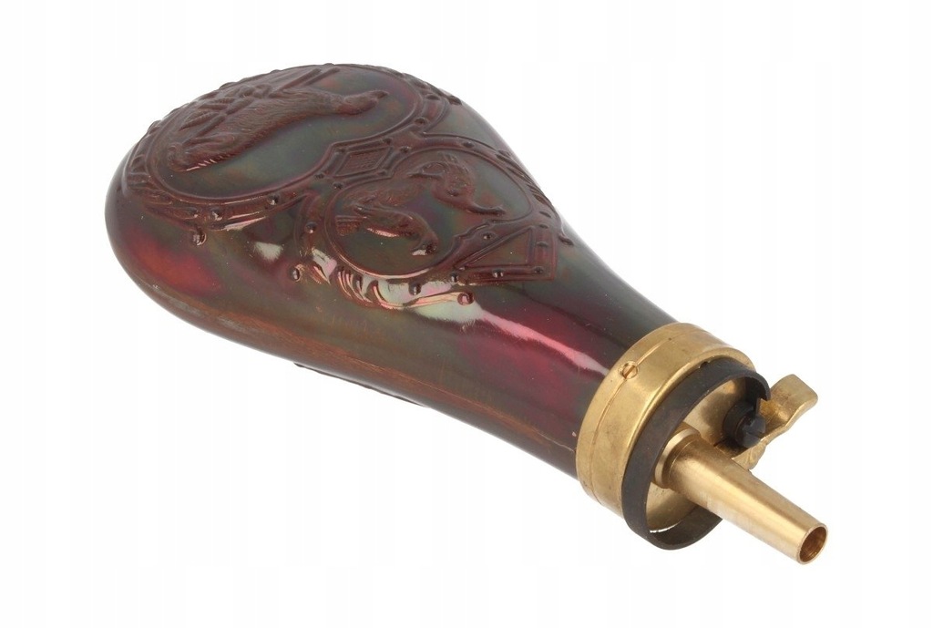 Фляга-фляга с охотничьим мотивом из лакированной меди и латунным дозатором.