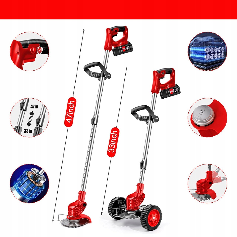 🌿🌿🌿【 Мощная беспроводная травяная косилка】 Электрическая травяная косилка с батареей с колесами сочетает в себе множество функций: садовый тик -Tickler, Lawn Edging, Cutter, травяная держатель, обеспечивает легкую производительность различных работ, связанных с стрижкой, он не ограничен, вы можете сделать траву. Zawiera 2 Akumulatory Litivo-Jonowe O Dużej Pojemności 2000 MAH, Prędkoś Silnika Wynosi 18000 obr./min.