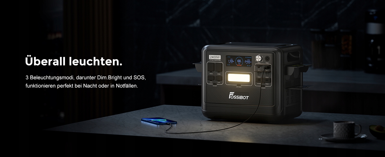 Солнечная электростанция F2400 с источником питания с выходной мощностью 300 Вт, 500 Вт, 700 Вт, 900 Вт и 1100 Вт, зарядка полностью контролируется, часть регулирования может передаваться в потоковом режиме, связана с расширением протокола FOSSiBOT F2400, хроническим программным обеспечением.