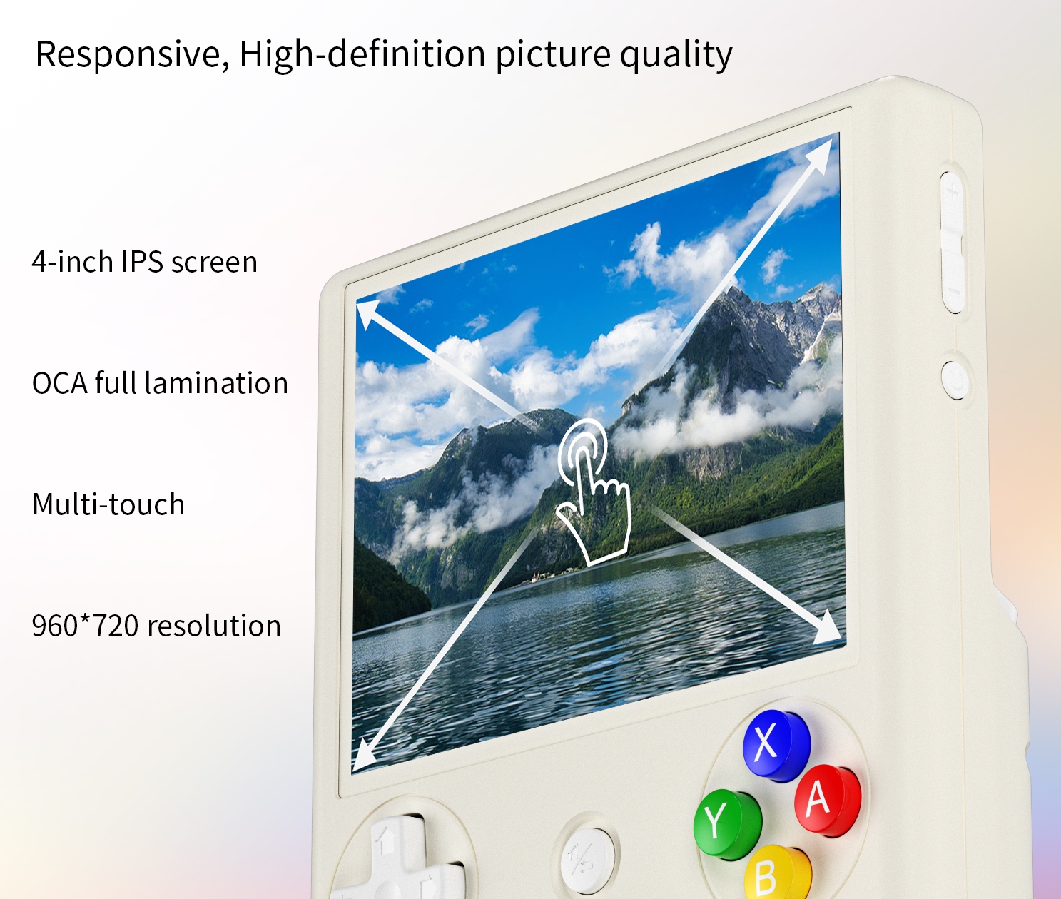 Anbernic RG406V предлагает экран с высоким классом с полным ламинированием, благодаря которому цветовое воспроизведение находится на высоком уровне, и количество световых отражений сохранилось до минимума, что особенно важно для игр на открытом воздухе. 4-дюймовая панель обладает поддержкой с несколькими приземлениями. Разрешение составляет 960 x 720 пикселей, что благодаря небольшому диагонали обеспечивает высокую плотность пикселей и оптимизирует использование графической системы. Производитель использовал MCD -матрицу IPS, которая гарантирует сенсационный контраст. Благодаря дисплею Anbebrnic RG406H ретро -игры никогда не выглядели так хорошо раньше и не имели такого хорошего воспроизведения цвета.