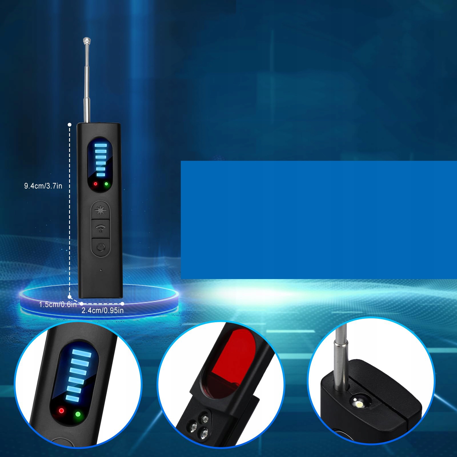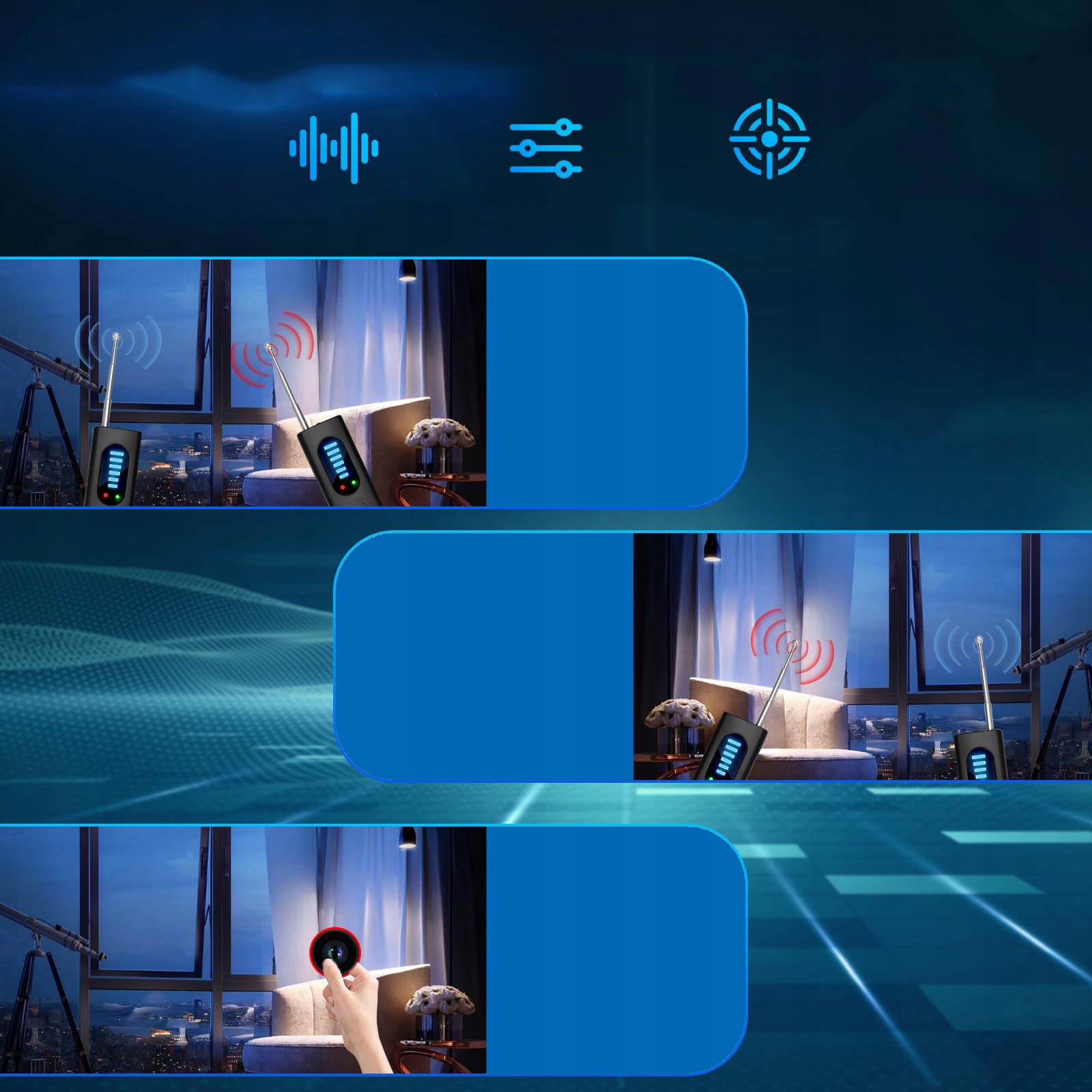 В этом продукте используется пассивная, беспроводная и инфракрасная технология сканирования. Режим обнаружения беспроводных сигналов может обнаружить радиочастотные сигналы в диапазоне частот от 1 МГц до 6,5 ГГц и отправлять оповещения. Регулируя интенсивность сигнала, вы можете не только обнаружить и найти источник радиоволн быстрее и точнее, но и предотвратить их блокирование, захват и отслеживание.