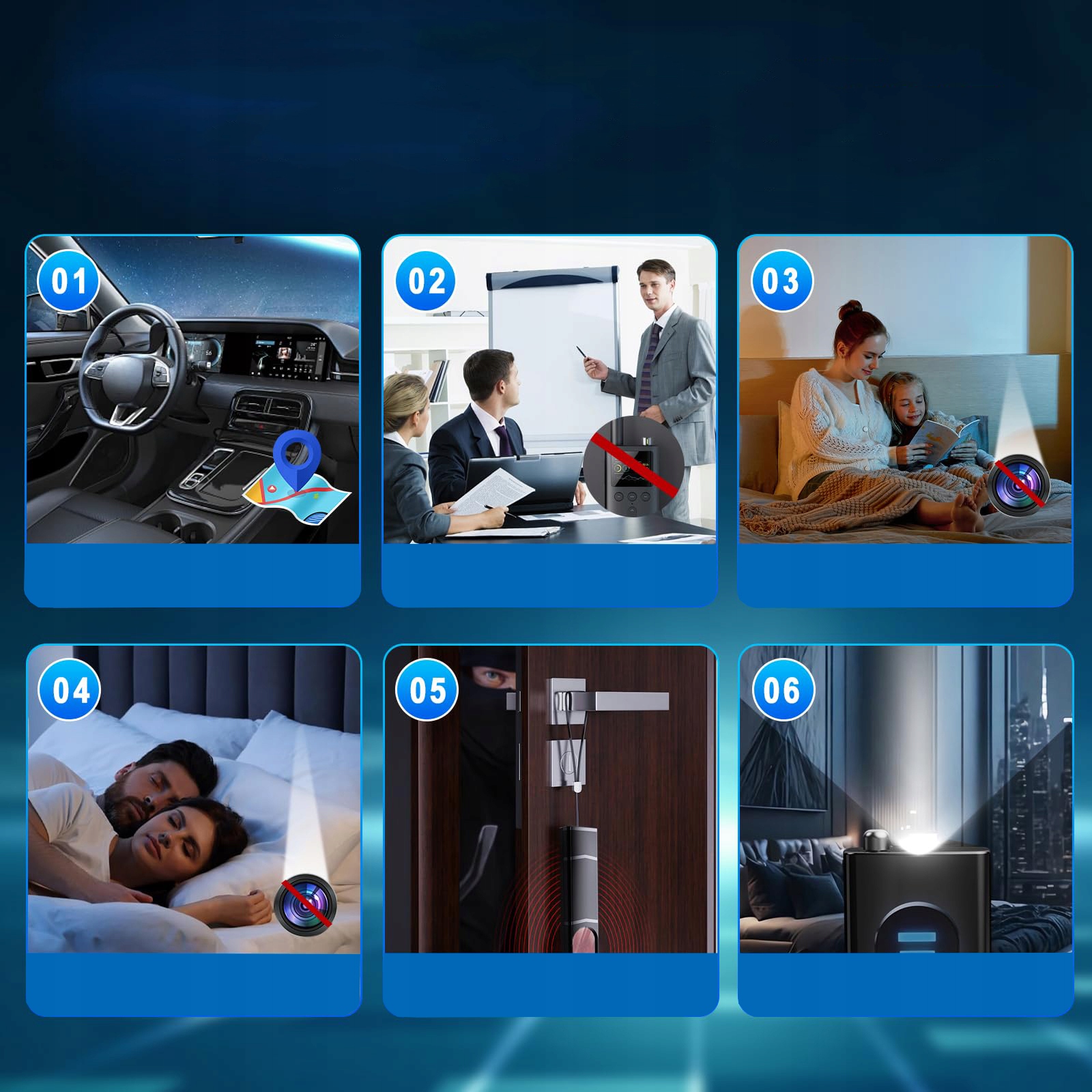 Скрытый детектор камеры может использоваться в домах, в офисах, отелях, мотелях, автомобилях, ванных комнатах, плащных комнатах, деловых переговорах, секретных встречах, военных районах, правительственных учреждениях, развлечениях или в качестве ежедневного сканера.