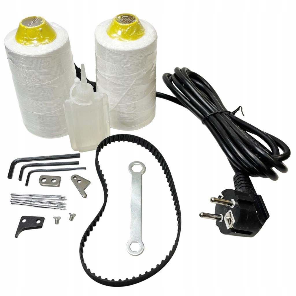 - В комплекте 2 катушки с нитками, 5 игл, сетевой кабель, клиновой ремень, запасной нож и набор ключей для его замены, масленка