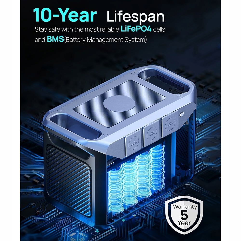 - Этот солнечный генератор оснащен батареей LiFePO4 емкостью 1382,4 Втч, известной своей превосходной термической и химической стабильностью, способной выдержать более 3500 циклов зарядки, что обеспечивает длительный срок службы. Срок службы батареи более 10 лет при ежедневном использовании цикла. Передовая система BMS и огнестойкие материалы класса V0 гарантируют долговечность и безопасность.