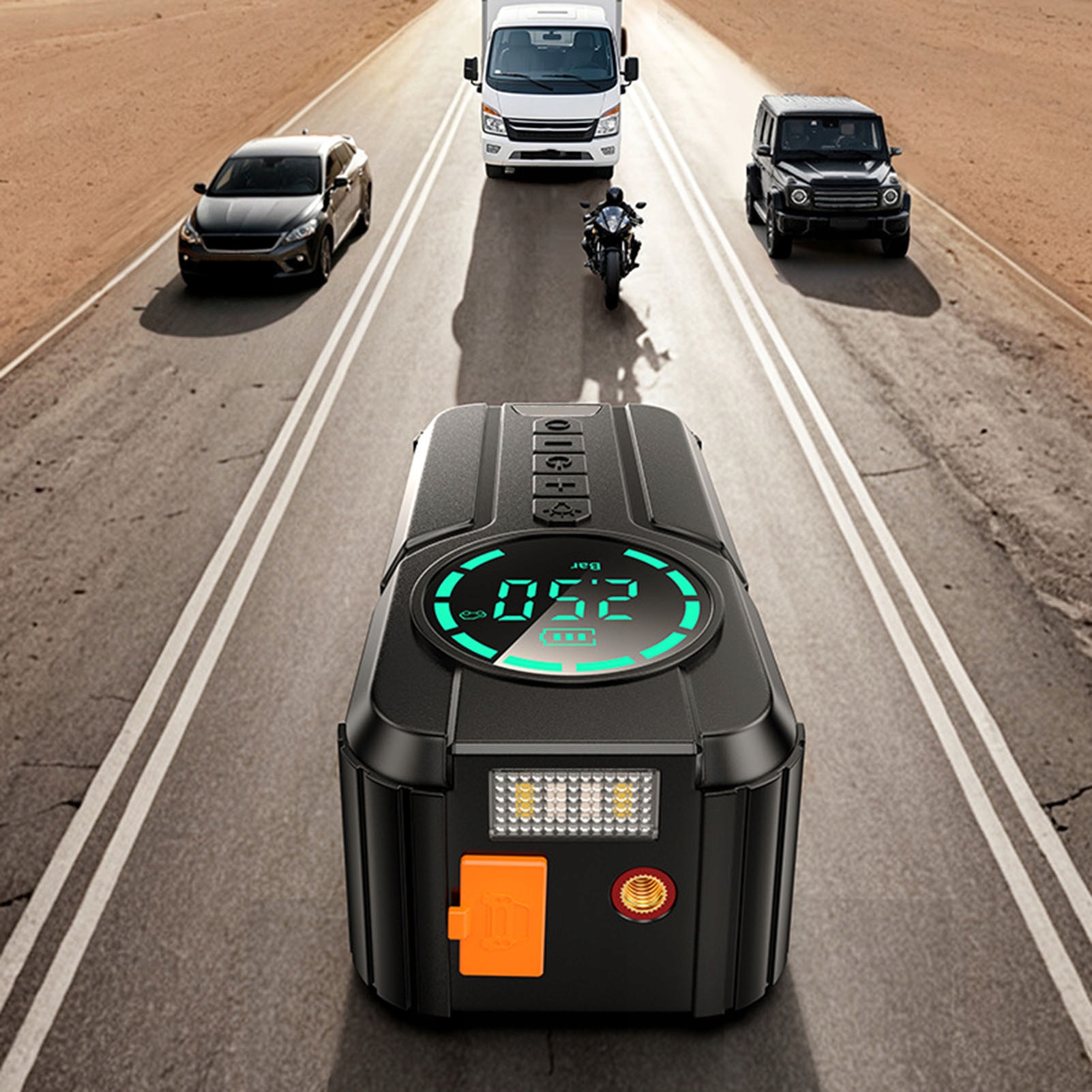 4. Функция аварийного запуска: Накачиватель шин обеспечивает функцию аварийного запуска в ситуациях, когда автомобиль не заводится, гарантируя, что вы всегда будете готовы к дороге, когда вам это необходимо.