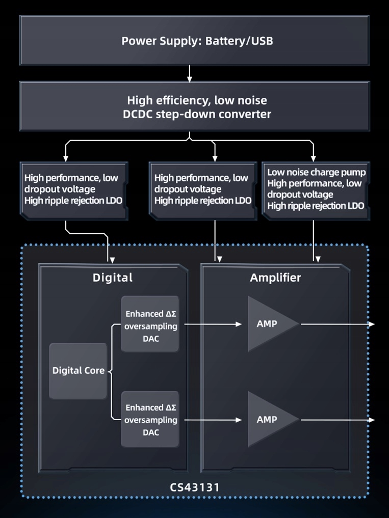 Каждый канал отключается с помощью высококлассной логики CIRRUS CS43131 Цифровой преобразователь. Чтобы эффективно опросить, это позволяет получить звук качества и очищения