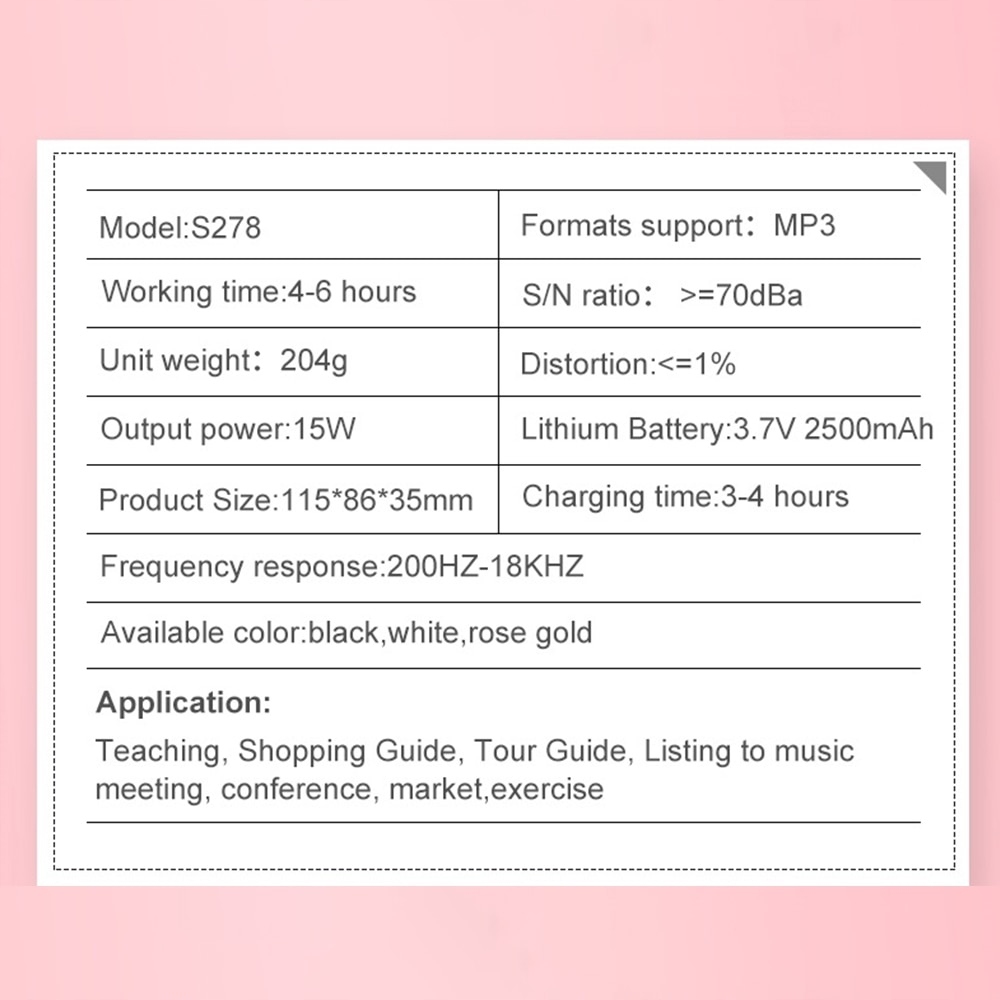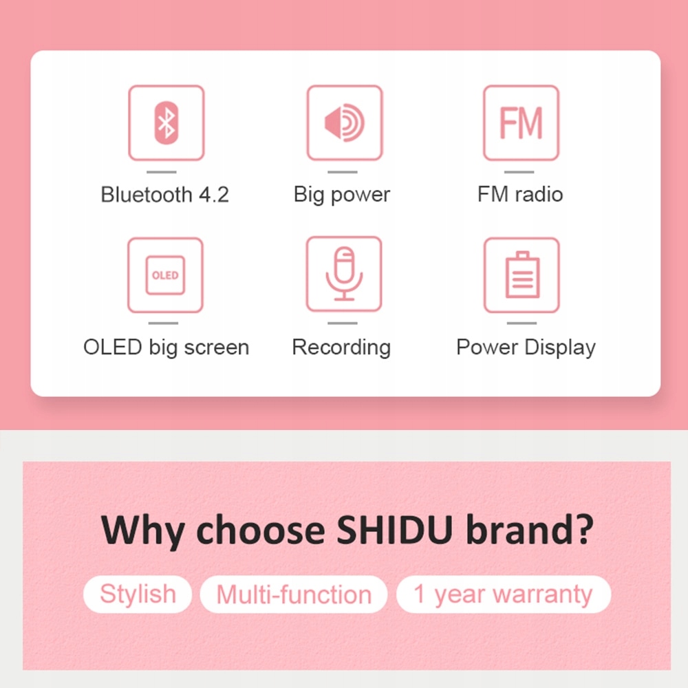 <р>1. Запатентованный внешний вид SHIDU; <р>2. Стильный, эргономичный и удобный дизайн; <р>3. Двойные магнитные трубы высокой мощности --- более прозрачные и проникающие; <р>4. Чип Bluetooth 4.2, передача сигнала происходит быстрее и стабильнее; <р>5. Проводной микрофон со встроенным высококачественным литиевым аккумулятором; <р>6. OLED-экран, 3,5-дюймовые двойные магнитные большие трубы HiFi, максимальная пиковая мощность до 15 Вт; <р>7. Принять электроакустическую систему усиления звука Shidu; <р>8. Оснащен специальным акустическим микрофоном SHIDU — оригинальное усиление звука HiFi; <р>9. Технология кодирования звука Super MP3 --- Поддержка TF-карт и флэш-дисков U; <р>10. Запись HiFi одним касанием; <р>11. Поддержка AUX – можно подключаться к компьютеру и работать в качестве динамика; <р>12. Поддерживает FM-стерео.Стандартная упаковка:
