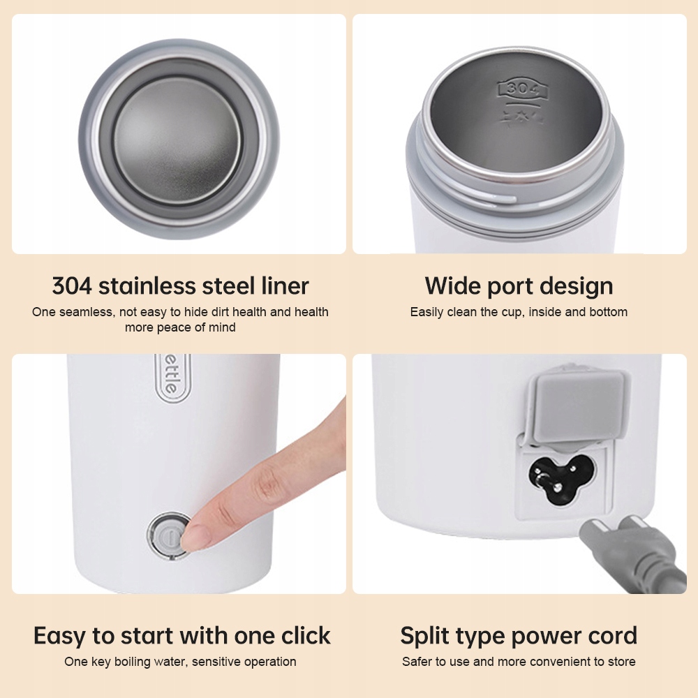 1. Компактный и портативный: электрический чайник емкостью 350 мл/1,5 чашки, легкий и портативный, легко брать с собой в сумку, рюкзак, чемодан, идеально подходит для путешествий, командировки, дома, школы и т. д.