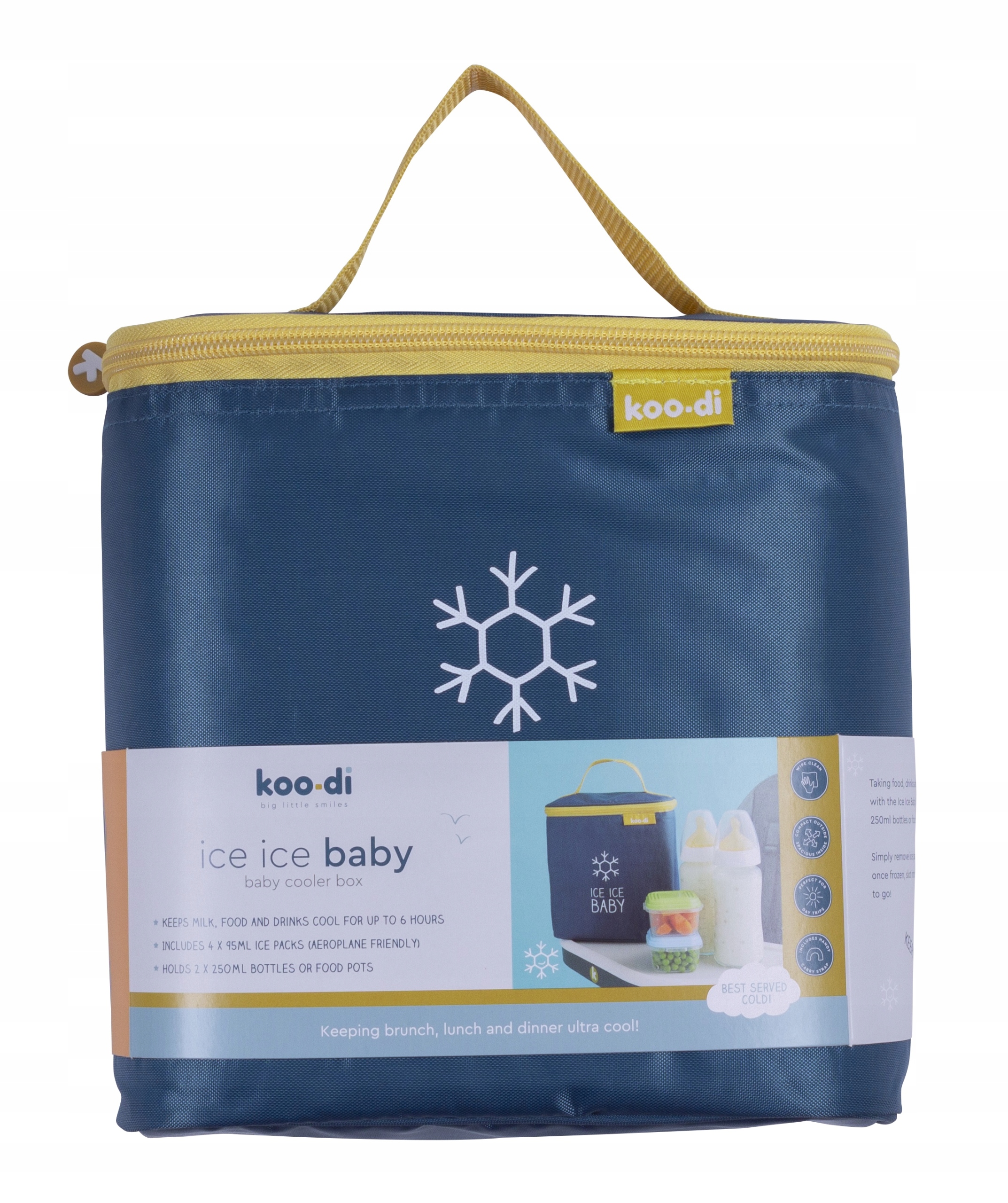 Portable Ice Baby Koo-Di холодильник-отличная альтернатива обычным тепловым мешкам. Он охлаждает молоко, пищу и напитки до температуры 5 ° C и удерживает его до 6 часов! Идеально подходит для праздничных поездок и путешествий, когда вам нужно позаботиться о правильной температуре пищи. Внутри есть 2 бутылки или пищевые контейнеры с емкостью 250 мл - или один из них. В холодильнике есть 4 внутренних кармана, в которых скрыты охлаждающие вставки. Просто удалите их, поместите их в морозильник ночью, и положите в карманы на следующий день, и это готово! Дополнительная ручка обеспечивает легкую и удобную передачу холодильника.