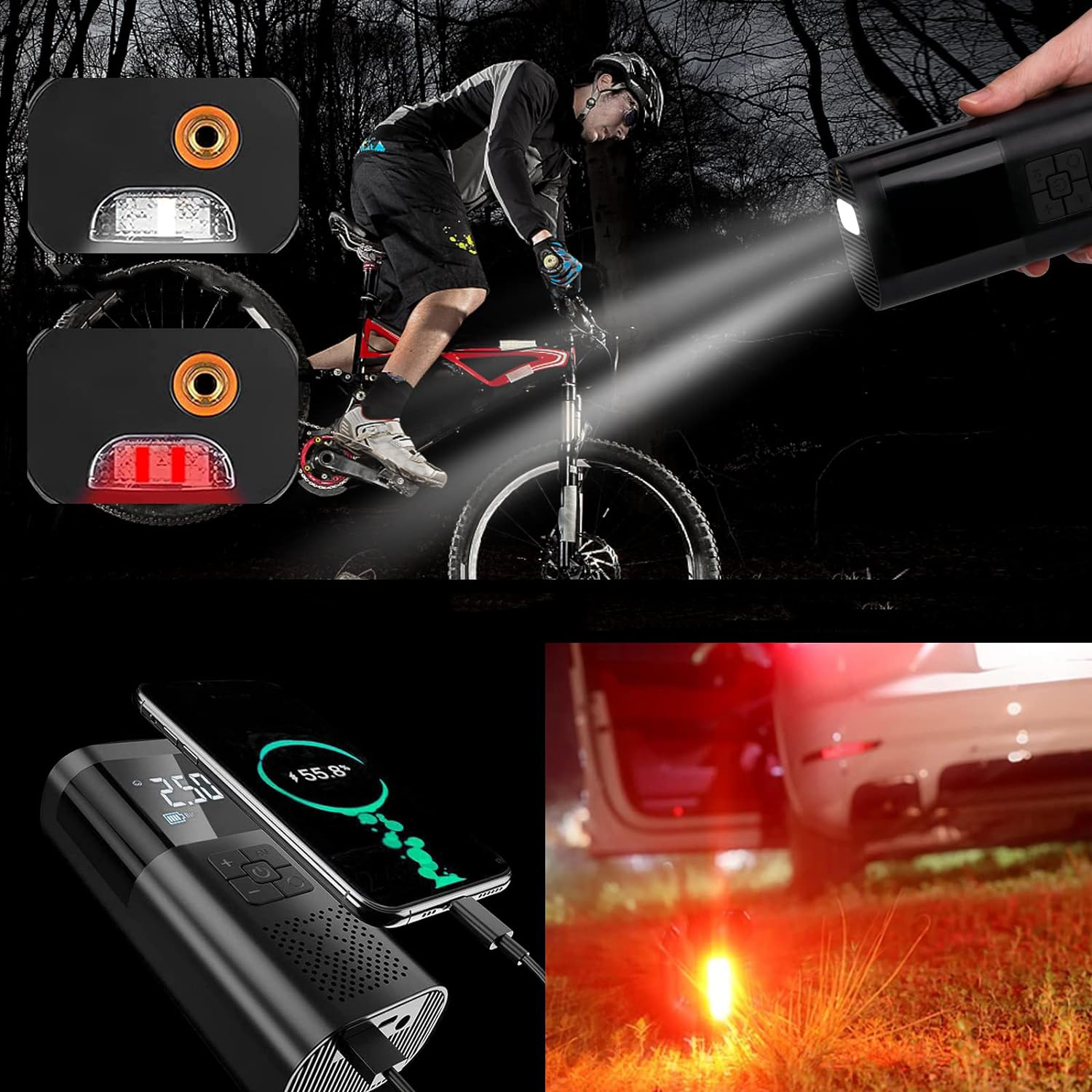 🔔🔔【 Многофункциональный электрический воздушный насос】 При подключении к клапану шин отображается точное давление шин, так что вы можете контролировать точное давление шин в любое время. Велосипедный насос также оснащен двумя вентиляционными отверстиями, которые могут использоваться для вакуумной машины и пылеудушки. Компрессор аккумулятора состоит из высокого яркого освещения, соуса, медленного мигания, сигнала тревоги и быстрого света, обеспечивает использование без проблем.