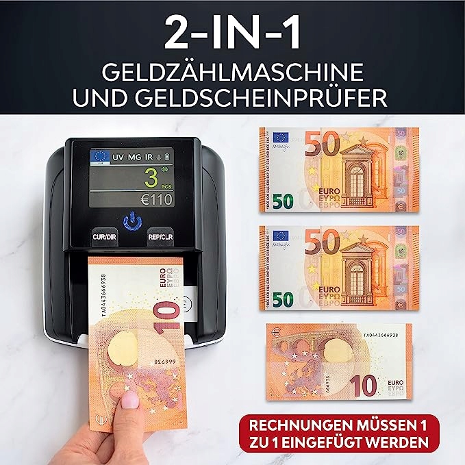 - Практично: счетчик денег со светодиодным экраном упрощает оплату банкнотами и защищает вашу компанию от фальшивых денег. Компактный, прочный и удобный в транспортировке, счетчик банкнот адаптирован для мобильного использования и распознает имеющиеся банкноты номиналом 10 евро, 50 евро, 100 евро, 500 евро - благодаря батарейкам подключение к электросети не требуется.
