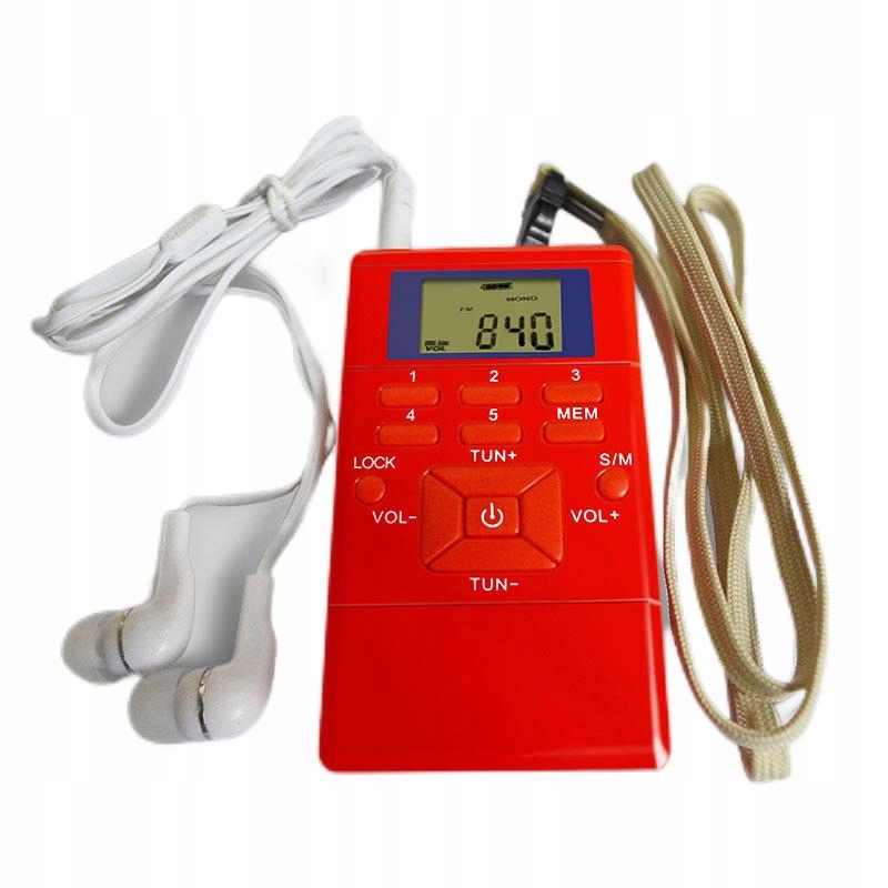 Мини-портативное FM-радио FM-радио с ЖК-дисплеем и цифровой обработкой беспроводного сигнала с наушниками белого цвета.