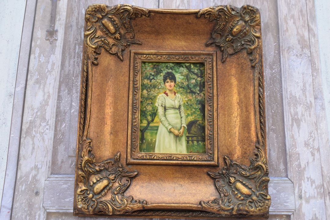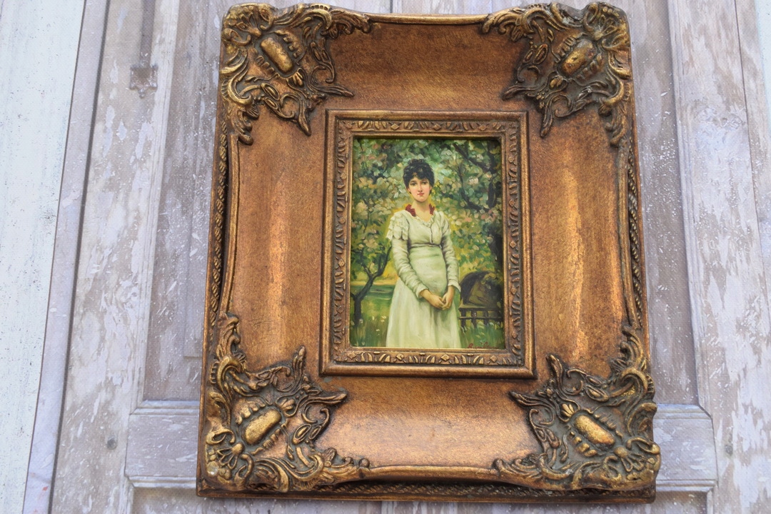 Портрет дівчини з сукнею в саду - картина маслом - золота рамка