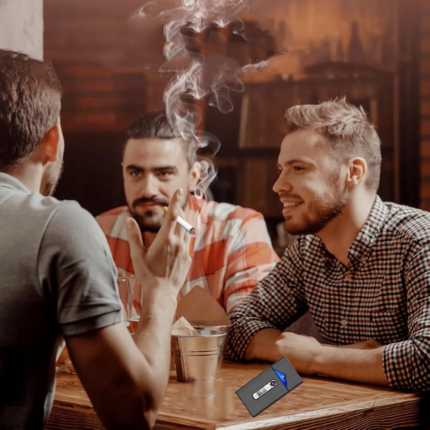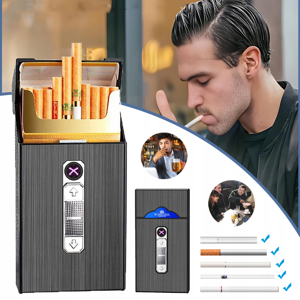 🚬🚬 【Большая вместимость】 Портсигар вмещает полную пачку из 20 обычных сигарет. Встроенная зажигалка двойной изогнутой формы, чтобы зажечь сигарету или сигару, просто сдвиньте кнопку.