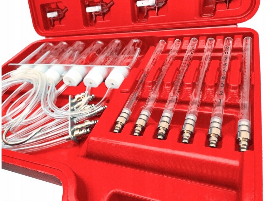 Устройство предназначено для диагностики инжекторов в дизельных двигателях максимум 6-цилиндра, оснащенной системой питания топлива для топлива с обычным железнодорожным. Это обеспечивает легкий и быстрый диагноз инжекторов на основе измерения количества топлива, разряженного при переносе инжектора. Благодаря этому можно легко найти возможный ущерб, утечки грязи или инжектора. Диагностика включает в себя соединение образцов или испытательной полосы, используя соответствующие адаптеры с переливными кабелями инжектора и сравнение количества топлива, обслуживаемого индивидуальными инжекторами. Администрация большей или меньшей дозы топлива с помощью любого инжектора означает его дефект. Он может быть использован во время запуска двигателя или во время работы на 6 цилиндрах одновременно