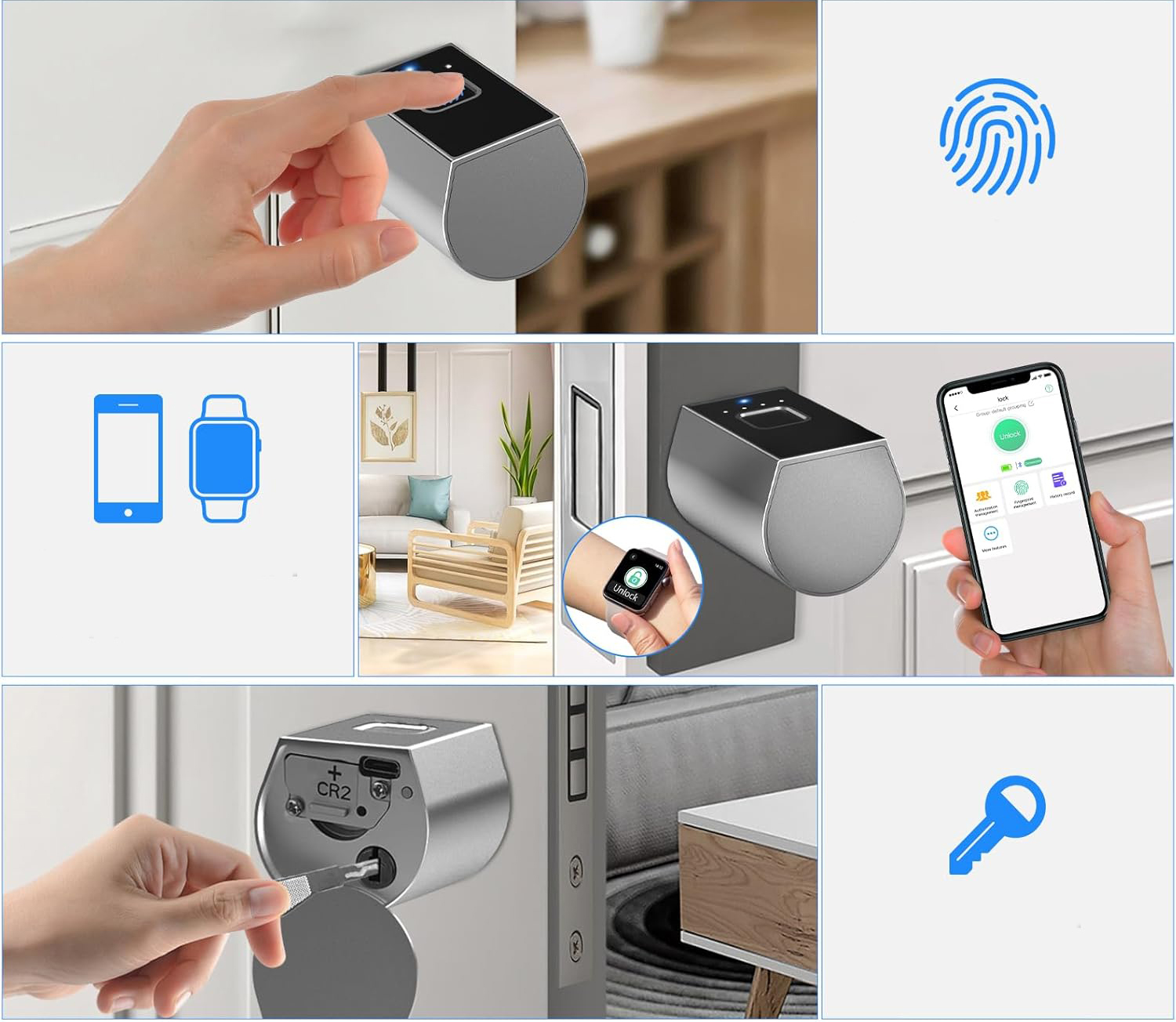 Умный замок 3 в 1: приложение Bluetooth, отпечаток пальца, ключ, поддержка Apple Watch. Память до 20 отпечатков пальцев. Оснащен двумя механическими ключами. Приложение Bluetooth поддерживает 1 основную учетную запись и 500 разблокируемых дополнительных учетных записей, что позволяет предоставлять разрешения членам семьи. Доступные приложения для iOS и Android: eSmartLock.