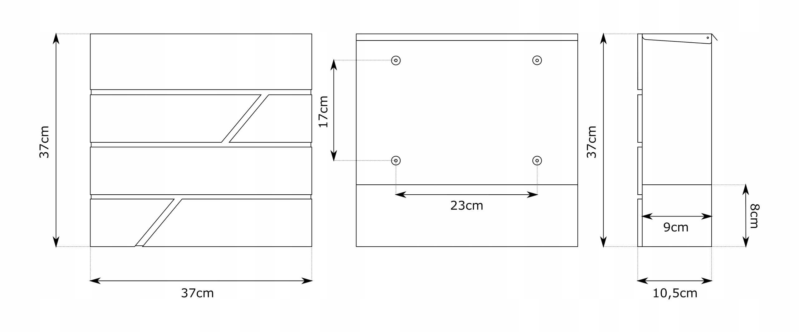 Сплошная верхняя крышка эффектно закрывает место молнии, открывающей переднюю крышку для вынимания писем. Крышка и дверь имеют резиновые амортизаторы, благодаря которым не будет лишних шумов при ветре или движении ворот. В комплект входит весь монтажный комплект (штыри, проставки, винты) и два ключа для замка европейского стандарта, которые при необходимости можно легко приобрести у любого производителя ключей. Очень простая сборка! - подготовленные крепежные отверстия.