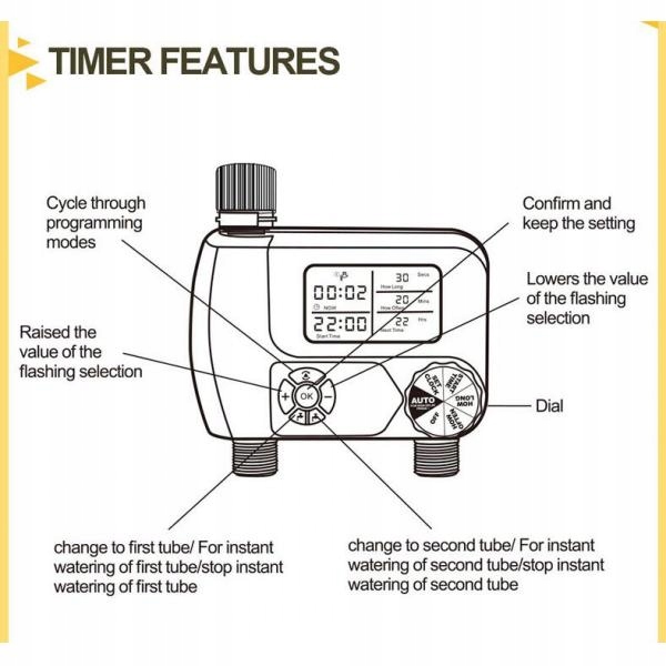 Большой светодиодный экран, а разборчивые цифры обеспечивают хорошую видимость в низких условиях или даже в темноте, легком обстановке, легкий 1 -й обзор программ полива