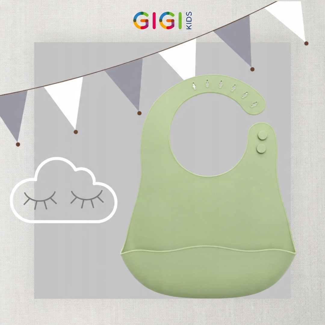 Посуд силіконовий дитячий, тарілка + миска + столові прибори + слюнявчик, зелений