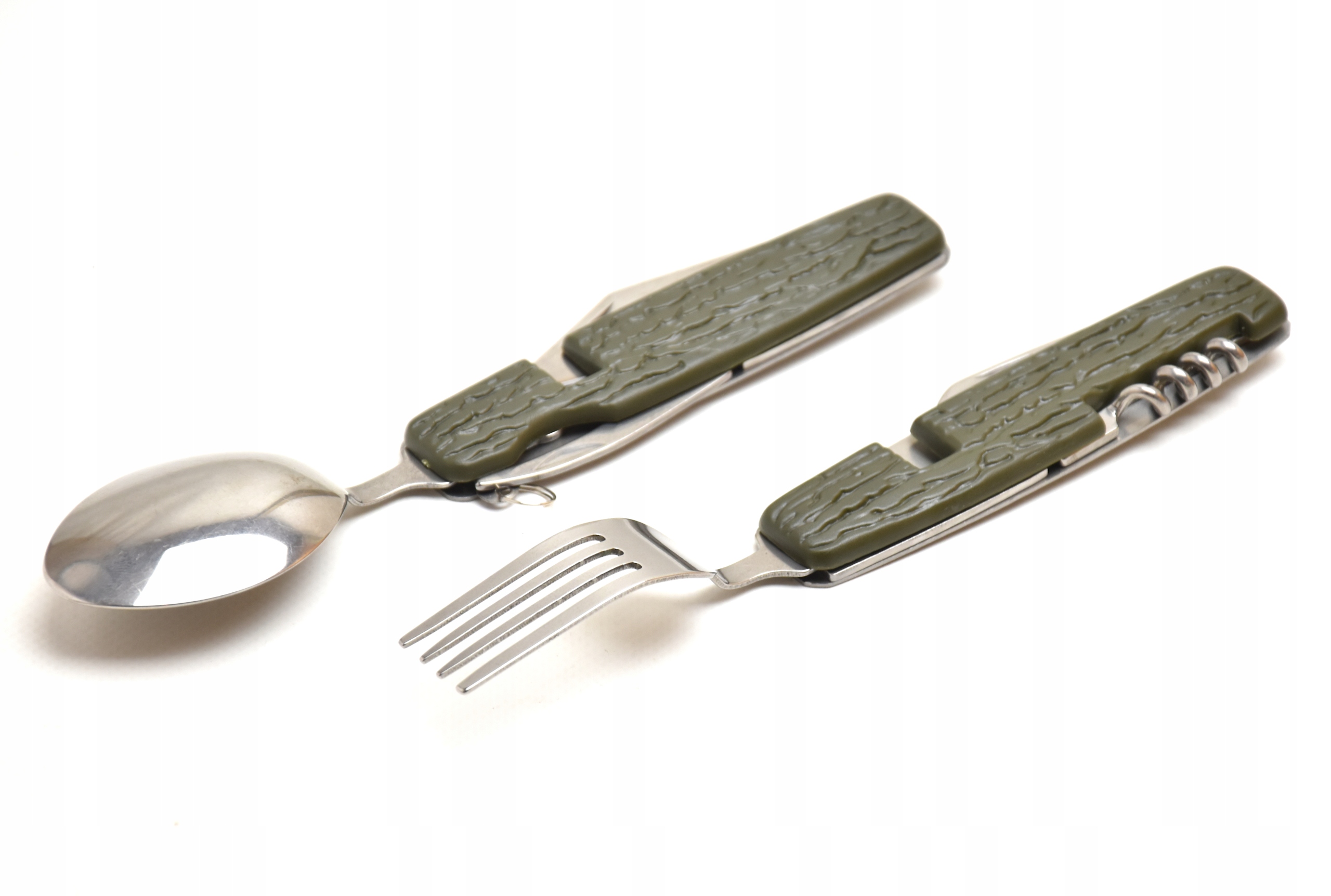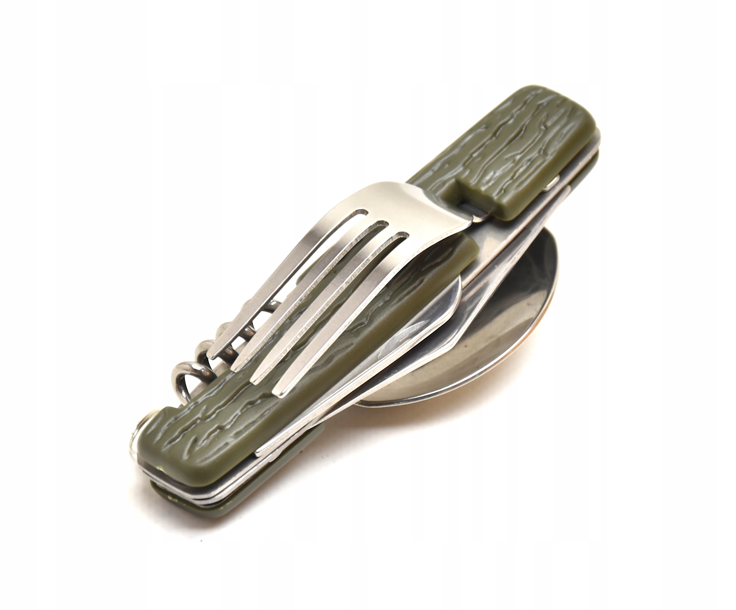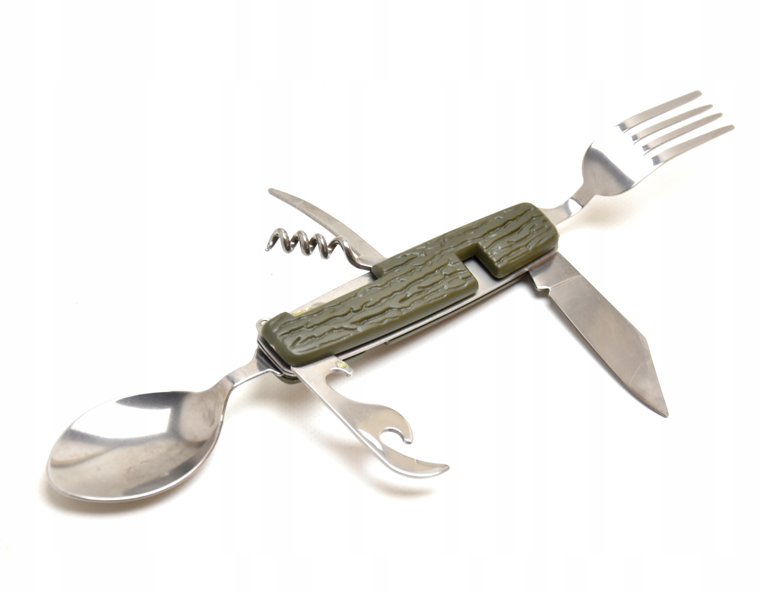 - нож, открывалка для бутылок, вилка, ложка и штопор объединены в один удобный карманный нож, который всегда можно носить с собой.