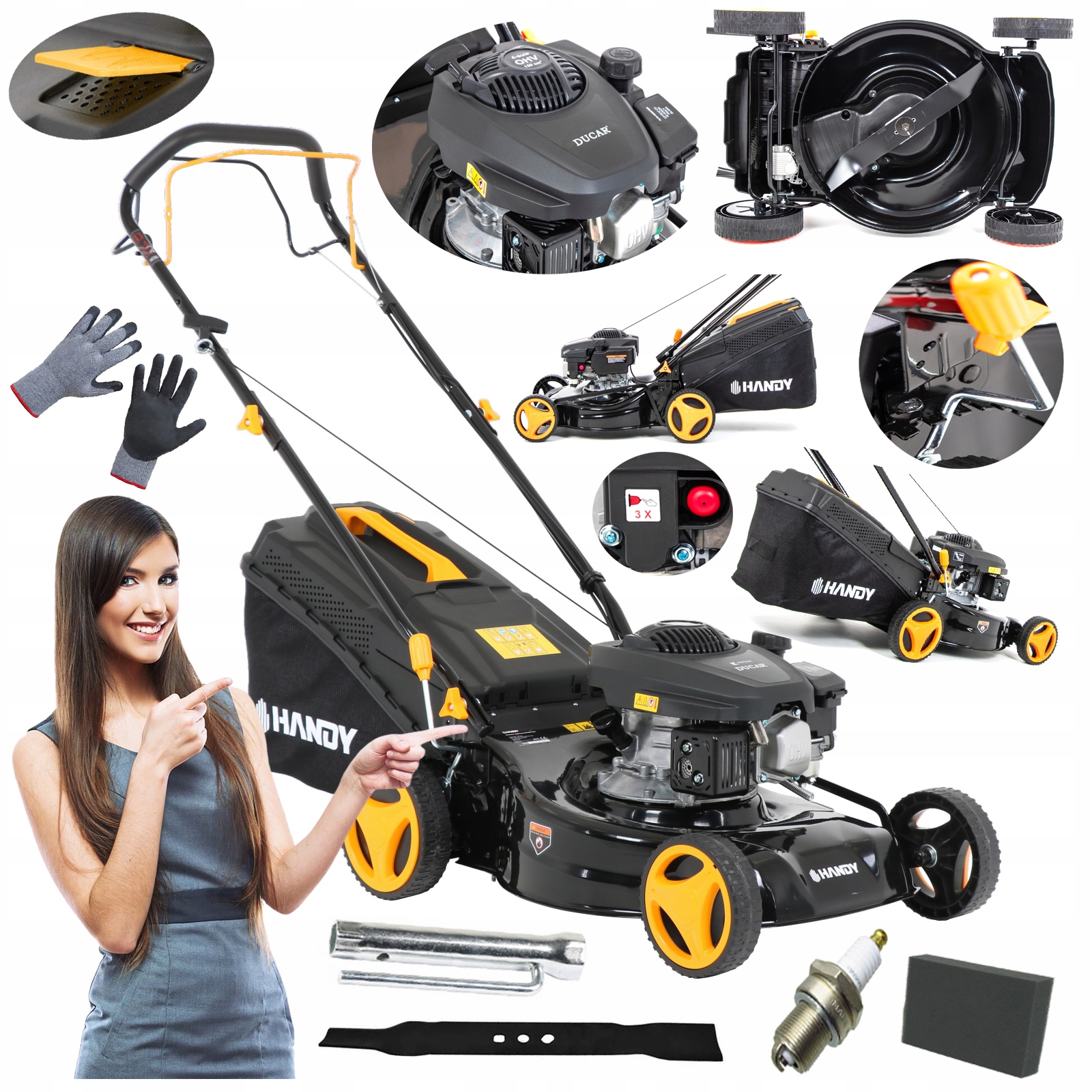 6в1: задний выброс, сбор, мульчирование, плавный пуск, скашивание мокрой травы, привод