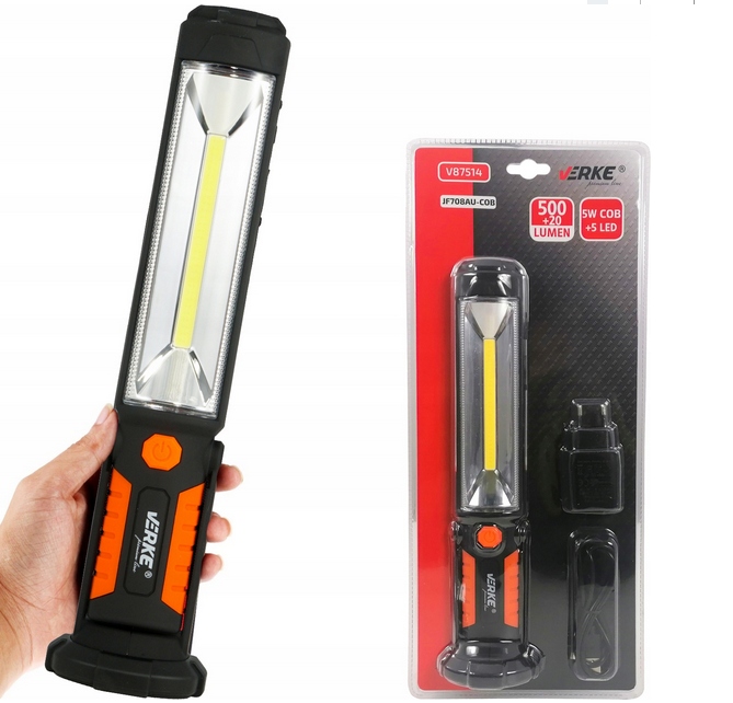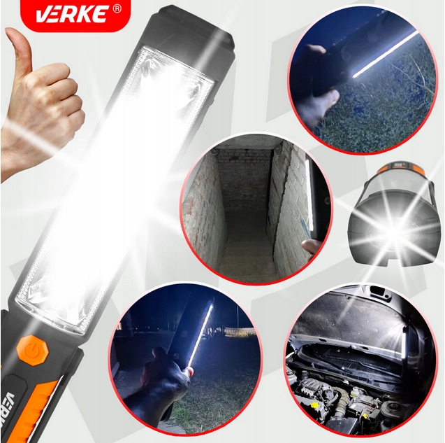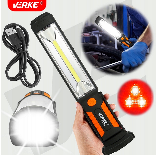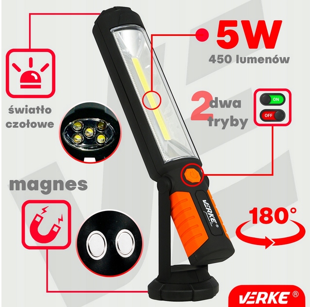 Благодаря использованию светодиодной технологии фонарик дает гораздо больше света по сравнению с традиционными и значительно экономичнее. Удобный корпус, устройство надежно лежит в руке. Большая емкость аккумулятора – 2600мАч обеспечивает длительную и бесперебойную работу. 2 встроенных магнита в основании и 1 сзади фонаря делают фонарь очень универсальным и удобным в использовании. Фонарь имеет 3 источника света - светодиодную ленту COB мощностью 5 Вт, прожектор со светодиодами вверху и знак аварийной остановки сзади фонаря. Продукция Verke прославилась в Польше благодаря превосходному качеству изготовления с аутентичными параметрами.