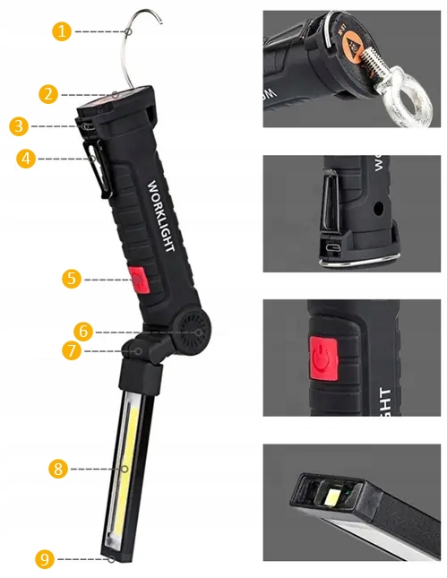 ⭐ Фонарик оснащен рядом функций, облегчающих работу, в том числе: крючок для подвешивания, магнит или подвижная головка с диапазоном движений 270 градусов, благодаря чему можно направить световой поток вправо направление. Кроме того, он оснащен светодиодом на передней панели, который позволяет подсвечивать элементы в узких углах.