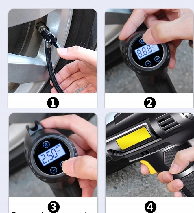 - Удобная ручка облегчает накачивание колес, а четкий ЖК-дисплей облегчает настройку заданного давления воздуха и смену агрегата.