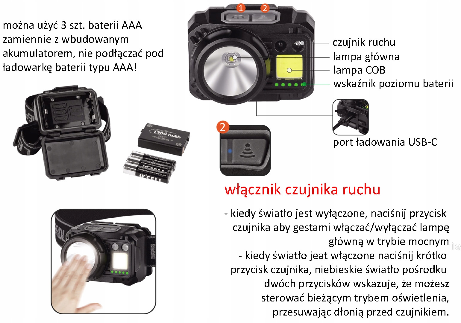 ✔️ Датчик движения - инновационное решение, позволяющее включать и выключать фонарь жестом руки, что повышает комфорт использования в сложных условиях, напр. при работе в мастерской или в поле.
