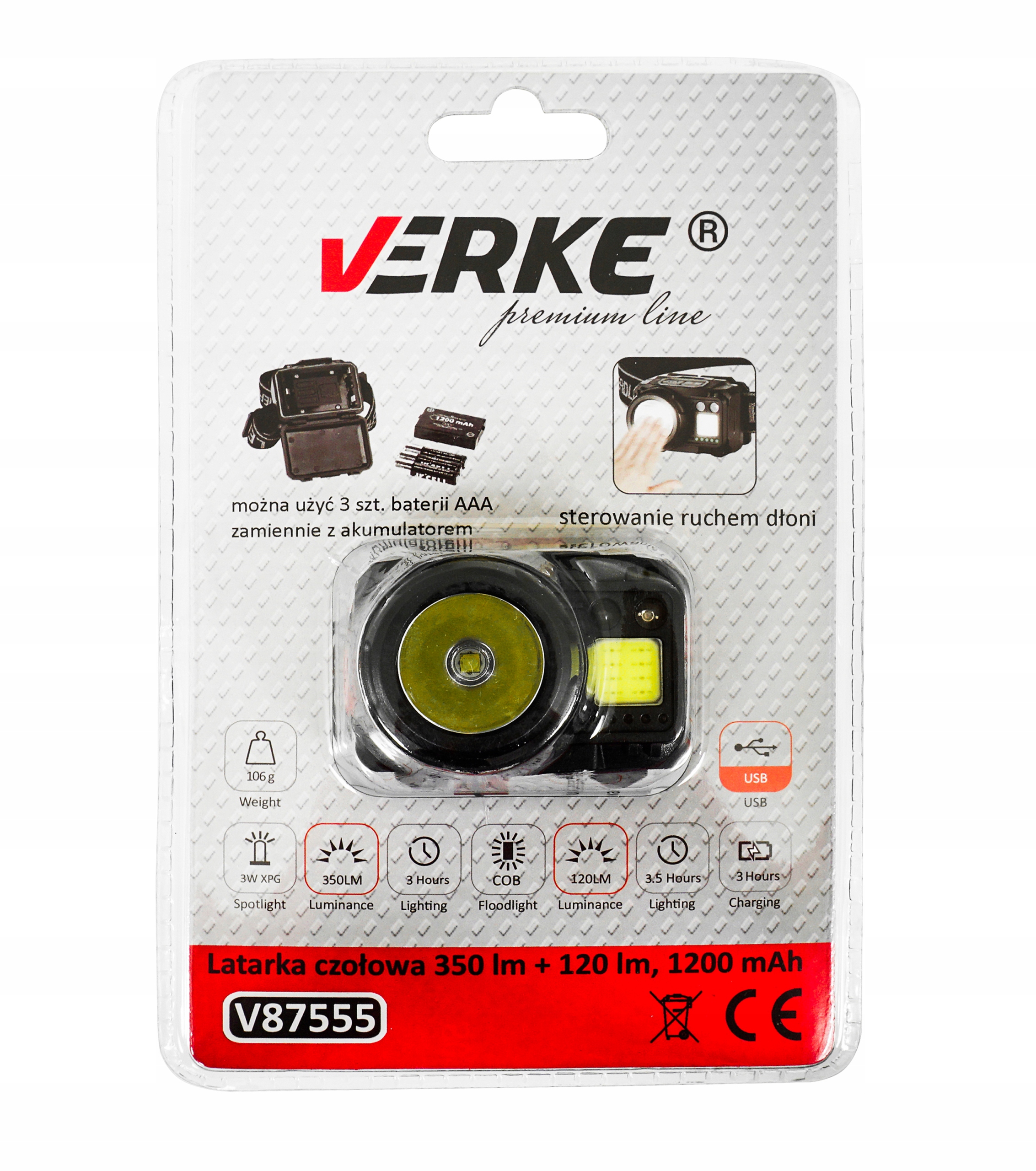Налобный фонарь VERKE V87555 оснащен современным COB-преобразователем и диодом CREE XPG3, генерирующим световой поток 350 люмен. Благодаря 6 режимам освещения, включая пульсирующий свет и красный сигнальный диод, пользователь может легко регулировать интенсивность света в зависимости от условий работы или активного отдыха.