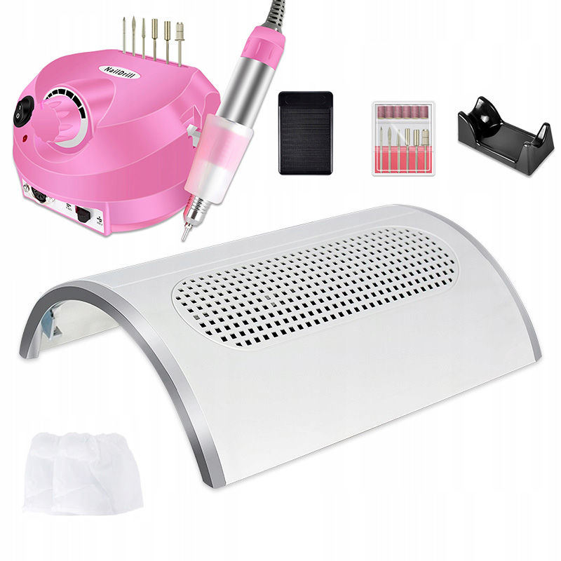 Сильный поглотитель маникюрной пыли «Белый пух» + профессиональная дрель для ногтей Rosfix «Розовая пантера» мощностью 65 Вт с ножной педалью + розовые фрезы