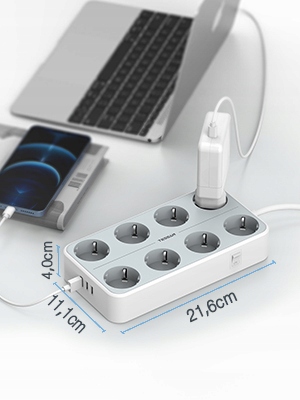 Этот удлинитель имеет более компактные размеры (21,6 х 11,1 х 4 см), что позволяет экономить много места. С 8 розетками и 3 портами USB. Одновременно можно использовать 11 электроприборов. Между тем, удлинитель — идеальный выбор для прокладки кабелей. Полная конструкция удовлетворит все ваши потребности в зарядке.