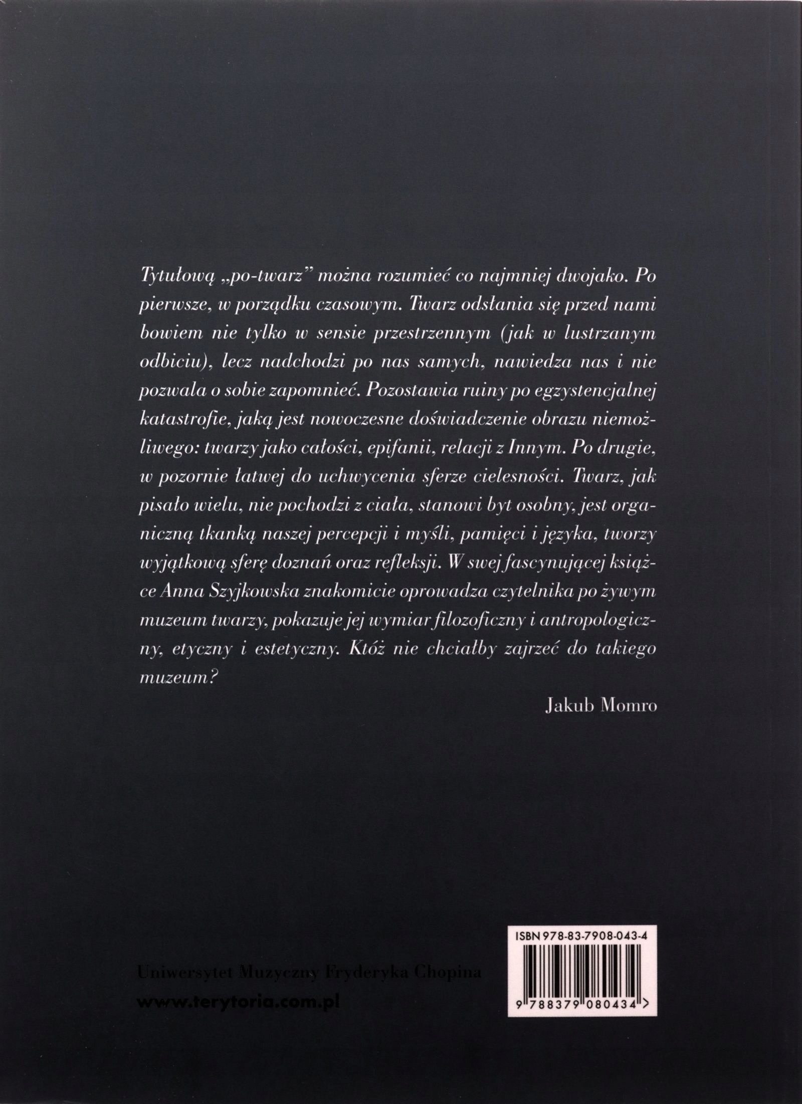 Лицо предложило нам свою красоту, полюс заставляет нас испытать возвышенное. Оба - в постоянной символической войне с телом - создают современные и современные модели идентичности. Они сосредоточены как на искусстве, так и на философии, пытаются самостоятельно понять и встретить другого человека. В ходе книги присуждается глубоко достижение корней визуальной трансформации лица в искусстве. К ним относятся, среди прочего, культурное господство в теле, разрыв с мимесом, кризис зрелищного силу, борьба с сексом или стереотипом возраста, критика образа образа. Интерпретации философских значений живописи и литературных произведений, а также выступлений включены в контекст изменений в технологиях и средствах массовой информации, вызовы против портретной живописи, ставя под сомнение концепции, важные для европейского гуманизма - идентификации, единства, души или целого - которые символизировало лицо. Пока - это лицо от тела. Выявляет процессы десимболизации, происходящие в культуре. Однако это не клеща.