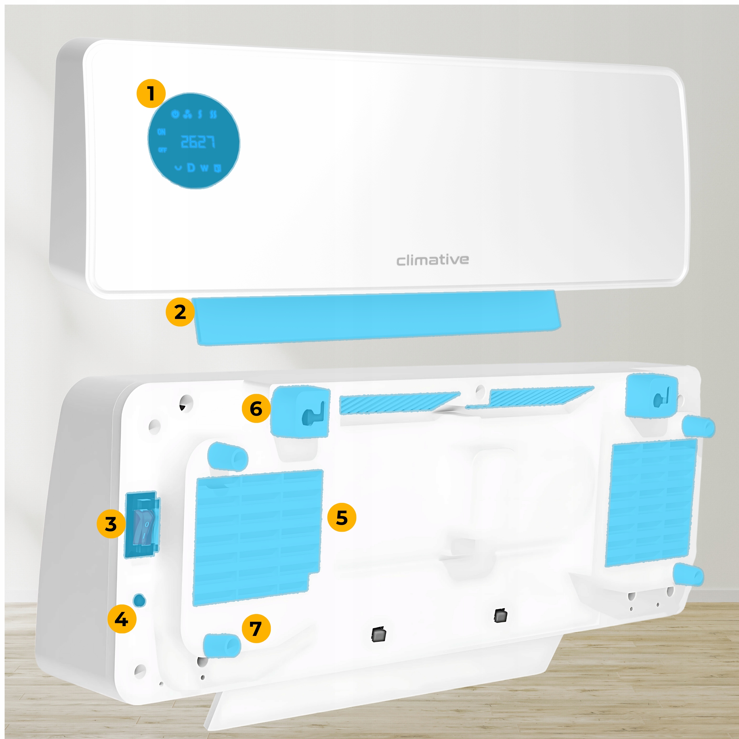 7️⃣ Задняя защита/распорные ножки - элементы, отдающие стену, которые стабилизируют установку и обеспечивают правильную циркуляцию воздуха.