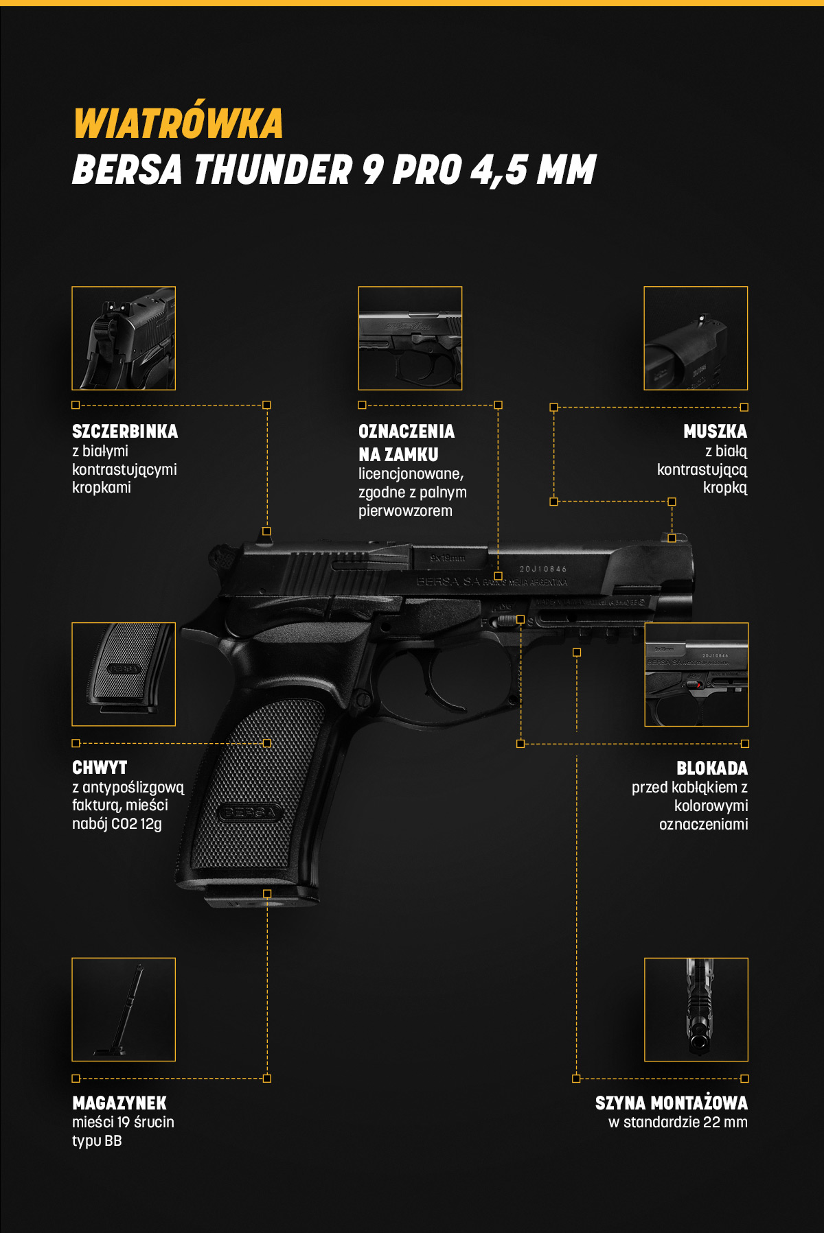 Лицензионный пневматический пистолет Bersa Thunder Pro 9. Воздух Винтовка изготовлена из прочного пластика. Пистолет имеет лицензионную маркировку производителя Bersa.